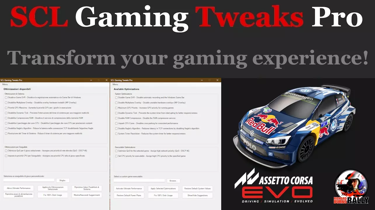 本指南旨在让《神力科莎EVO》达到极致流畅度,避免画面撕裂、卡顿以及延迟问题。 本指南的目标并非在关闭垂直同步的情况下实现1000或更高帧率。 请记住,任何后台运行的覆盖层、Steam覆盖层以及录制程序都可能导致意外的卡顿和延迟,如果你不使用它们,强烈建议不要启用! 就目前情况而言,《神力科莎EVO》尚无法在60帧率以上保持稳定且无卡顿的运行。 1. 为你的游戏电脑准备相关软件 2. 下载Nvidia Inspector 3. SCL Gaming Tweaks Pro 4. SCL Gaming Tweaks Pro