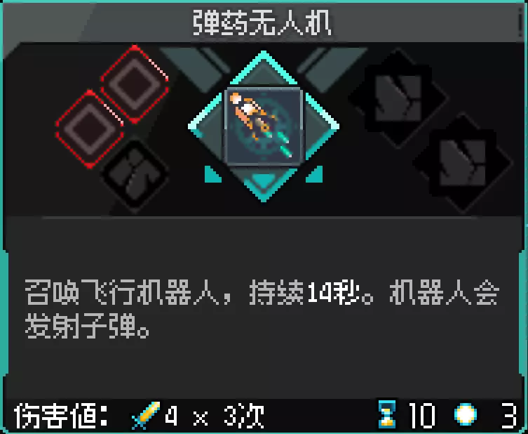 突破极限 在村庄中为一个低级技能解锁全部三个额外技能槽位 这里描述不太准确、明确。这里的“低级技能”“额外技能槽位”具体指的是什么不用在意,游戏内大部分情况下,技能都只有2个孔被堵住,只要见到有3个孔是封住的技能(这种就是低级技能)就拿上,然后存450蓝血,找大关卡中间休息区——村庄右侧打孔的老鼠,给三个孔全部打开即可。比如轮椅无人机技能即是低级技能: