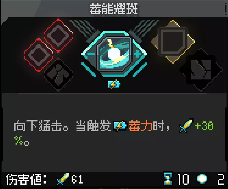 蓄力锤:游戏中,不同构筑在不同武器模组下基本都能成型。但蓄力锤操作难度高,且动作模组因为蓄力特征的限制,导致通用性不佳。游戏为蓄力设置了不少专属的道具,环环相扣,但也因此导致成型难度高。 玩法思路:选择单一技能构筑,一般蓄力技能都是高基伤低段数,所以我们收集百分比增伤组件;另外就是拿增加技能能耗相关的组件,武器本身被动高能耗转增伤;对蓄力模组本身有优化的组件同样需要考虑,但注意:【蓄力过程中不会被击败】和【蓄力时收到攻击立刻完成蓄力】相斥,在未构筑大成的情况下需要避免共存。推荐技能:【蓄能耀斑】/【蓄能穿刺】(其中【蓄能穿刺】具体玩法见【碎颅!!】成就)