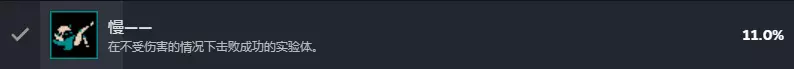 【慢—— 在不受伤害的情况下击败成功的实验体】 通常第一关并不能做到秒杀Boss,所以这是考验动作玩法基本功的成就。其实并不难,Boss设计非常标准的“新手导师”,尤其是在制作组热补降低了难度后,给的受击判定时间和碰撞箱非常宽松,动作模组也比较简单,基本就是左右攻击,翻滚躲避就行。特别需要注意的是Boss怒吼和进入二阶段时上方掉落的石块,可能比Boss还容易破防。