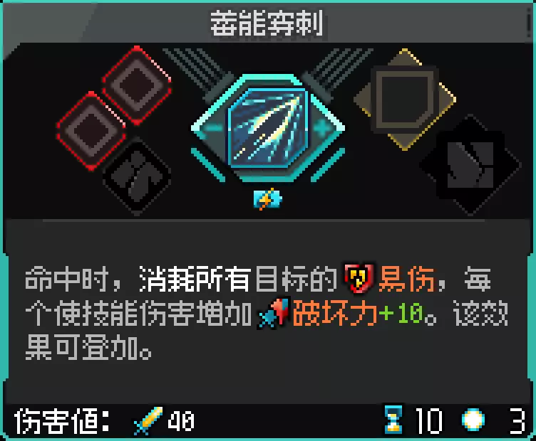 使用【十字跃斩】短冷却时间连续攻击堆叠大量易伤效果,随后通过蓄能穿刺一次性叠加高额基础伤害。搭配易伤自身的伤害乘区以及各种蓄力组件的满额伤害乘区,可轻松达成上万伤害。