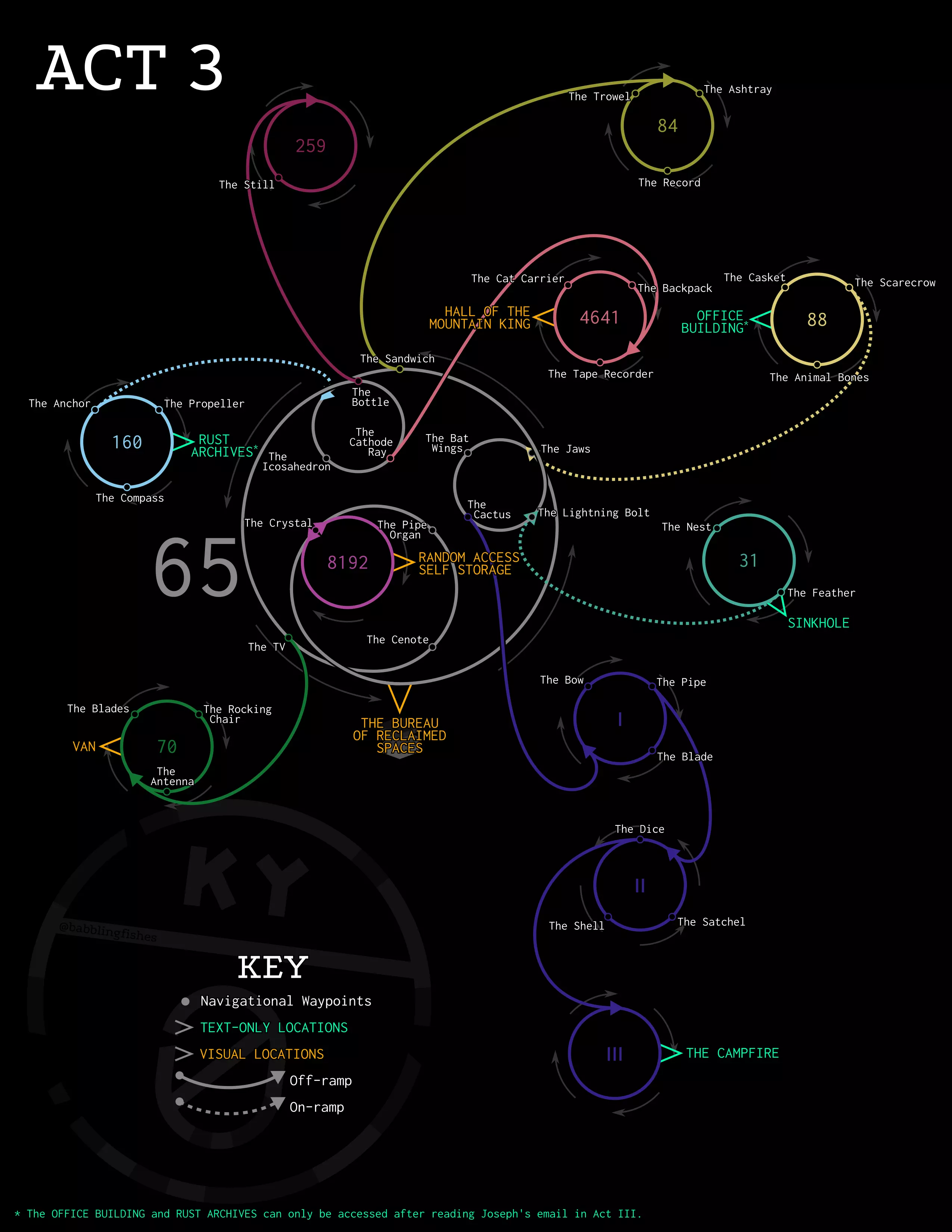 零号国道导航参考指南 简介 零号国道,一条位于肯塔基州地下深处的神秘公路¹,由一系列非欧几里得环²组成,仅凭记忆导航相当困难。 在第三章中,我厌倦了查看日志中关于如何到达或离开特定关键地点的模糊指示,同时也不想错过任何非关键地点,于是我双向遍历了所有路线,并记录下各个物体/图标以及它们通往不同路线的入口/出口。之后,每当我迷路时,我都能通过找到任何物体并在列表中查看来重新确定方向。观察结果 除一条路线外,所有路线的地形以及沿途出现的物体都会根据你是顺时针还是逆时针行驶而发生变化。 如果你停下来点击这些物体,有些会显示文字,有些会触发场景,还有些会将你引导至不同的路线。 会改变你路线的物体上会有一个返回/掉头箭头图标。要更改路线,你可以点击该箭头,或者在物体前停下后直接改变移动方向(从顺时针变为逆时针,反之亦然)。当你沿4641号公路顺时针行驶时,会遇到4样东西:磁带录音机、山大王殿、猫笼和背包。 如果你在任何地方停下并开始逆时针行驶,你仍会在4641号公路上,但会看到总共5样东西:阴极射线、孩子们(试炼)、灯笼、山大王殿和绳子。 如果你在除阴极射线前方以外的任何地方停下并再次改变方向(改为顺时针),你仍会在4641号公路上,并沿着最初列出的那4样东西的路径行驶。 如果你继续逆时针行驶,上述物品会开始重复出现,因为你将一直在绕圈子。不过,如果你在阴极射线装置前停下并改变方向(或点击它),你将不再处于4641号公路,而是进入65号公路。65号公路拥有自己的一系列物体、地点和连接,具体取决于你行驶的方向。因为阴极射线装置是一个物体通道/坡道/装置,它能将你从65号公路传送到4641号公路,或者从4641号公路传送到65号公路。 以下将对这些通道进行下划线标注。65号公路 > 顺时针方向 回收空间局 水晶 → 通往8192号公路 管风琴 楼梯 投影仪 钟 树 链轮 锚 → 通往160号公路 自行车 羽毛 → 通往31号公路 独轮手推车 鹿角 稻草人 → 通往88号公路 < 逆时针方向 回收空间局 下颚 蝙蝠翅膀 仙人掌 闪电 三明治 → 通往84号公路 二十面体 阴极射线 → 通往4641号公路 瓶子 → 通往259号公路 电视 → 通往70号公路 天然井 管风琴 水晶 → 通往8192号公路 从羽毛出发的31号公路: > 顺时针方向 污水坑 鸟巢 羽毛 → 通往65号公路 < 逆时针方向 隧道 鸟屋 爪 从电视出发的70号公路 > 顺时针方向 厢式货车(Phil and Jane成就) 刀片摇椅 天线<逆时针 电视→前往65号公路 谷仓 孩子们(跳舞) H型车架货车 84号公路 从三明治处>顺时针 烟灰缸 唱片 泥铲<逆时针 孩子们(泥巴和石头) 麦克风 护目镜 三明治→前往65号公路 88号公路 从稻草人处>顺时针 动物骸骨 办公楼(在第三幕阅读约瑟夫的电子邮件后可用) 棺材 稻草人→前往65号公路<逆时针 划艇 蝙蝠喂食器 钟摆 160号公路 从锚处>顺时针 螺旋桨 铁锈档案(在第三幕阅读约瑟夫的电子邮件后可用) 指南针 锚→前往65号公路<逆时针 灯塔船 浮标 漩涡 259号公路 从瓶子处>顺时针仍需逆时针:桶跑阶梯、瓶子 → 前往65号公路 来自4641号公路:阴极射线管 顺时针:磁带录音机、山大王大厅、猫咪运输箱、背包 逆时针:孩子们(试炼)、灯笼、山大王大厅、绳子、阴极射线管 → 前往65号公路 来自8192号公路:水晶 任意方向:随机存取自助仓储 水晶 → 前往65号公路 视觉地图 后来我发现他们的维基上有视觉地图。虽然我个人觉得列表是更快定位自己的方式(通过Ctrl+F搜索物品名称来了解自己的位置,而不是在两张地图上目视寻找物品名称),但这些地图能很好地可视化当前情况,并且包含了一条隐藏路线(紫色标注,在第五章可用)。多亏了制图师,我现在才注意到这条路线。