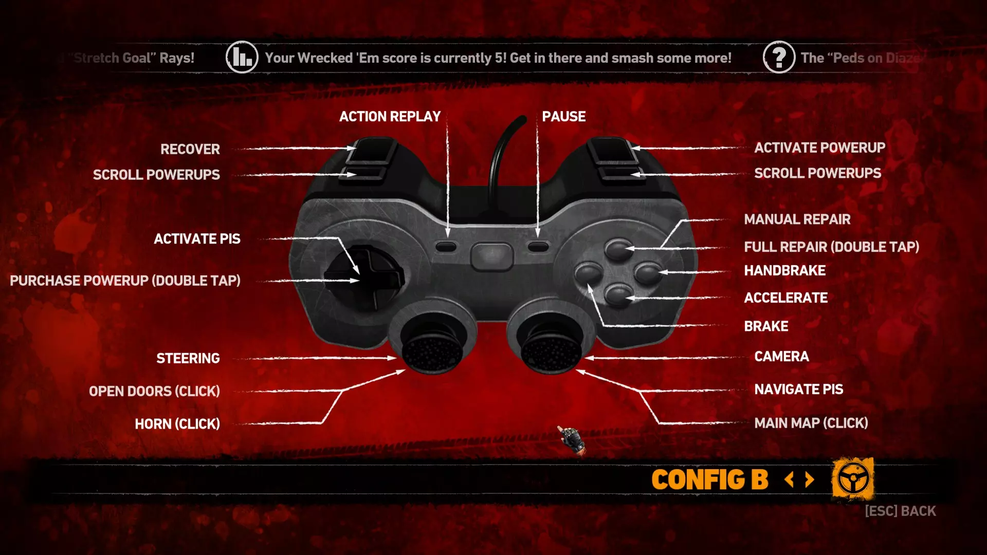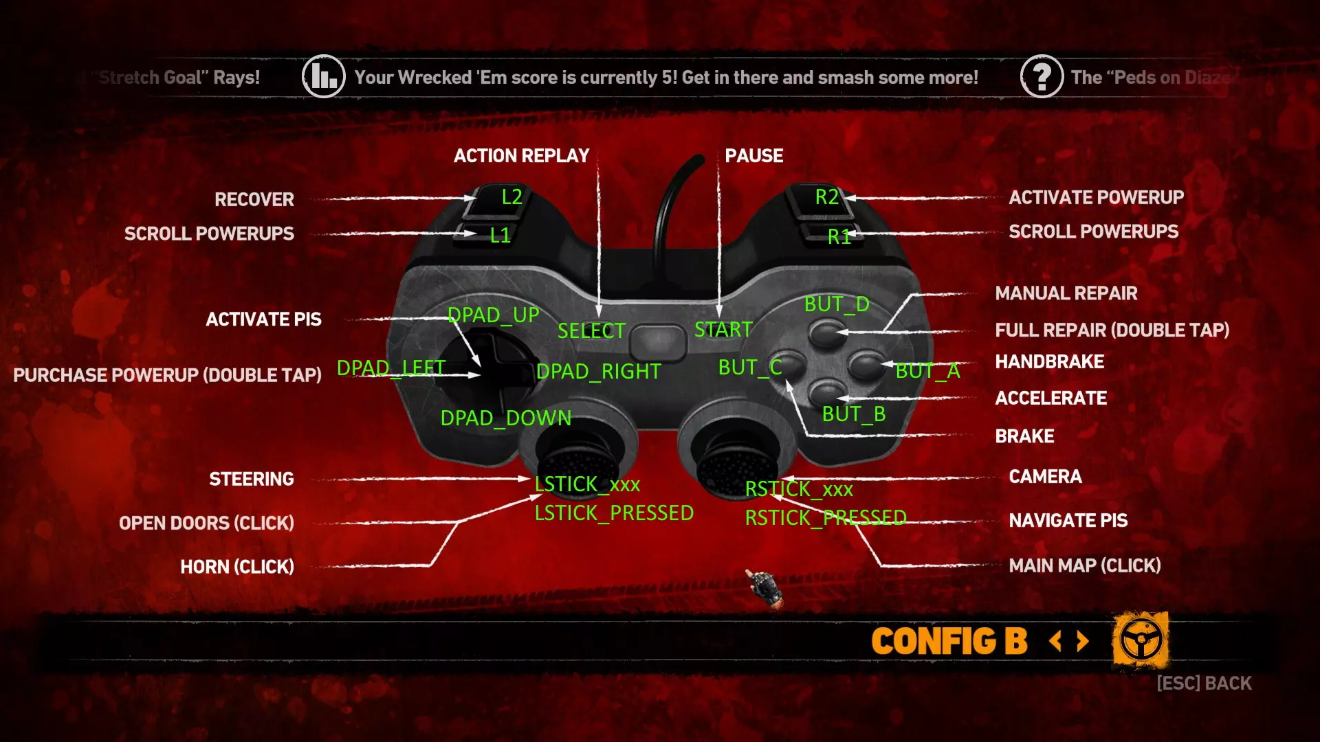 将截图打印在A4纸上 启动一场比赛 了解你的设备 进入游戏后,你需要弄清楚游戏手柄每个按钮的功能。按下这些按钮,并在面前打印好的截图上做笔记。 也许你的手柄完全适配,也许有些按钮是互换的,甚至无法使用。 提示:对于道具控制,你需要先收集一些道具! 退出游戏 导航至“...Steam SteamApps common Carmageddon Max Damage Data_Misc default_controls ” 打开你使用的手柄预设文件 现在将你的按钮与按钮名称进行匹配,并在截图上做笔记 我的映射如下: