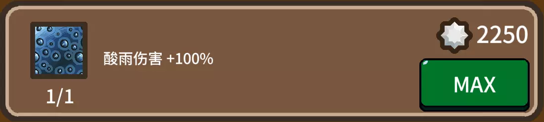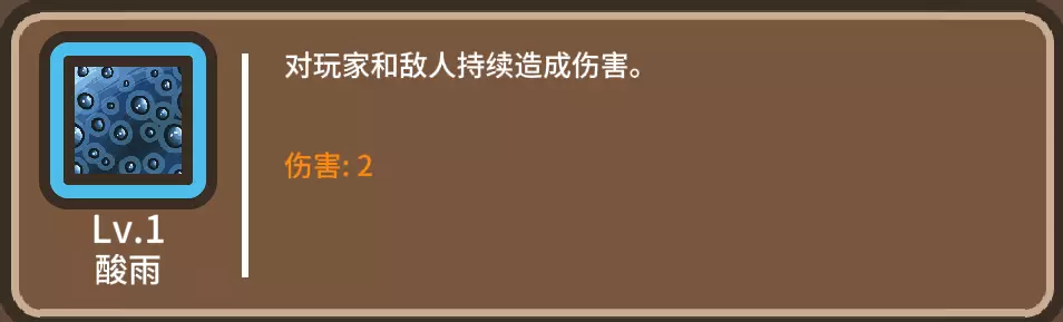 酸雨,高贵的全屏伤害,当屏幕出现几百只小怪的时候,我愿意称它为真神。输出量高得离谱,输出量越高,射的能量箭越多。哪怕你没有受到酸雨的伤害,酸雨照样能触发愤怒的效果,而愤怒是加攻速最多的技能。别看一级酸雨才2点伤害,但是各种杂七杂八加起来10点伤害,因此必须要点伤害减少技能。酸雨也算把双刃剑,一定要确保酸雨不会对你造成伤害!不然护盾怎么叠起来抗住boss伤害。避雷的技能。