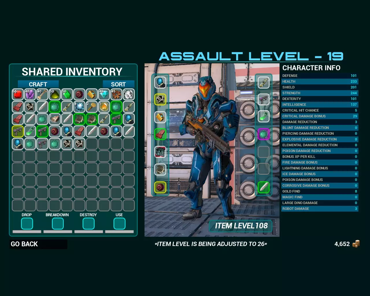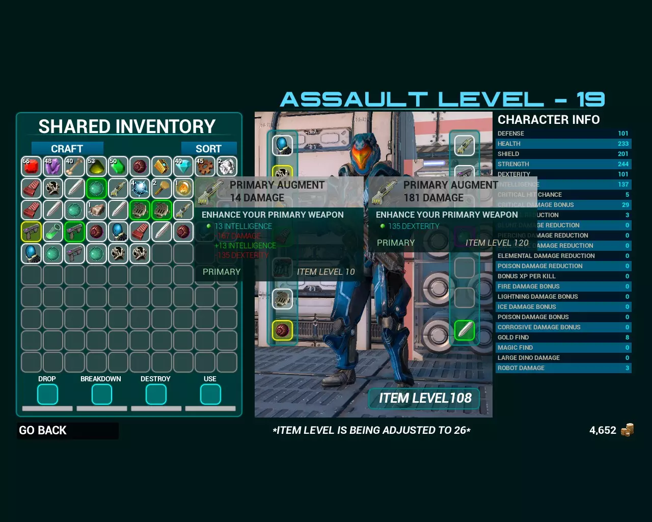 要选择另一个物品,你必须将其移到角色旁边。在屏幕右侧的结束界面,你可以看到自己拥有的加成信息以及这些加成的效果。在左下角有四个方框,分别标有“丢弃”“分解”“摧毁”和“使用”。你可以将物品拖入这四个方框中的一个。“丢弃”和“摧毁”的功能很直观。“分解”是将无用的强化部件拆分成 craftingmat(对于某些 craftingmat,这是获取它们的唯一途径)。消耗品(经验值、生命值、护盾提升和传奇宝箱)需要拖入“使用”方框。接下来是什么?没什么了。为什么?因为我无法运行游戏。