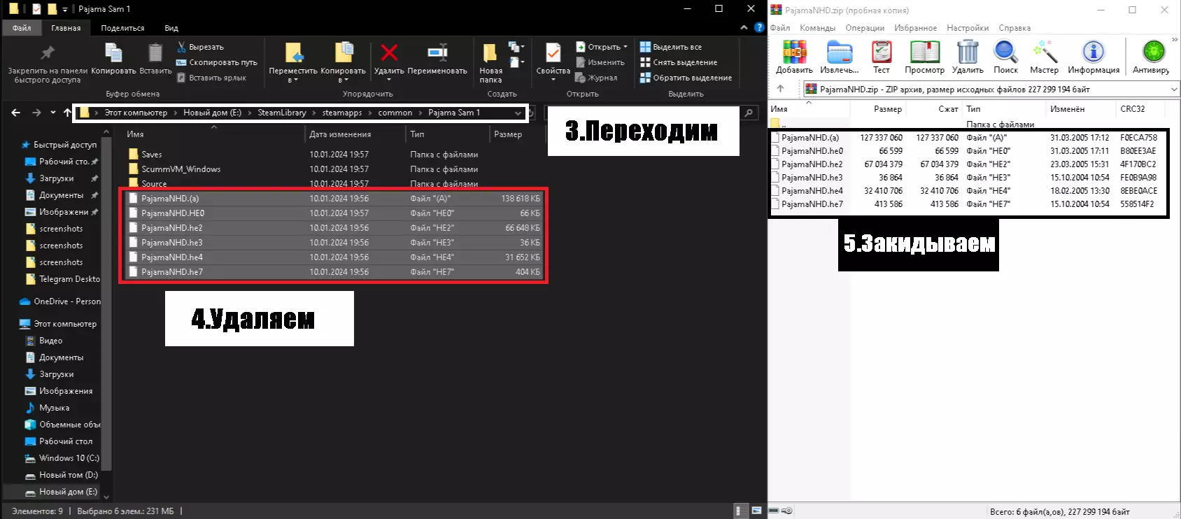 -下载文件后,我们进入你存放游戏的文件夹,以我为例:(我的电脑_游戏所在磁盘_steammaps_common_“Pijama Sam 1”),截图中有示例。 -直接删除默认的6个文件,然后将压缩包中的文件放入该文件夹。