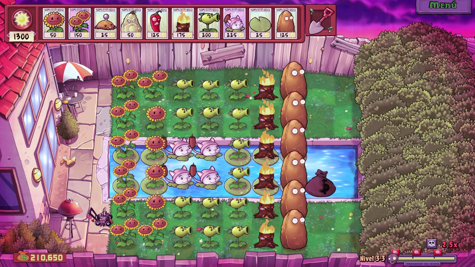 泳池关卡 使用植物 阳光类:向日葵和双胞向日葵 辅助类:火爆辣椒、土豆雷和磁力菇 防御类:猫尾草、双发射手和火炬树桩 强化类:睡莲和高坚果 策略 阳光获取方面,和白天关卡的做法相同。种下第一株双胞向日葵后,尽快放置猫尾草,同时不要停止种植向日葵。放置猫尾草后,最好在泳池中种植高坚果,以阻挡潜水僵尸和海豚僵尸(分别从3-3和3-8关卡开始出现),同时继续种植猫尾草和双胞向日葵。 最后逐步填满场地,交替种植双发射手和火炬树桩,此时可以开启2倍速。5.只需注意保护坚果存活即可。 目标花园:花园应看起来与此类似。