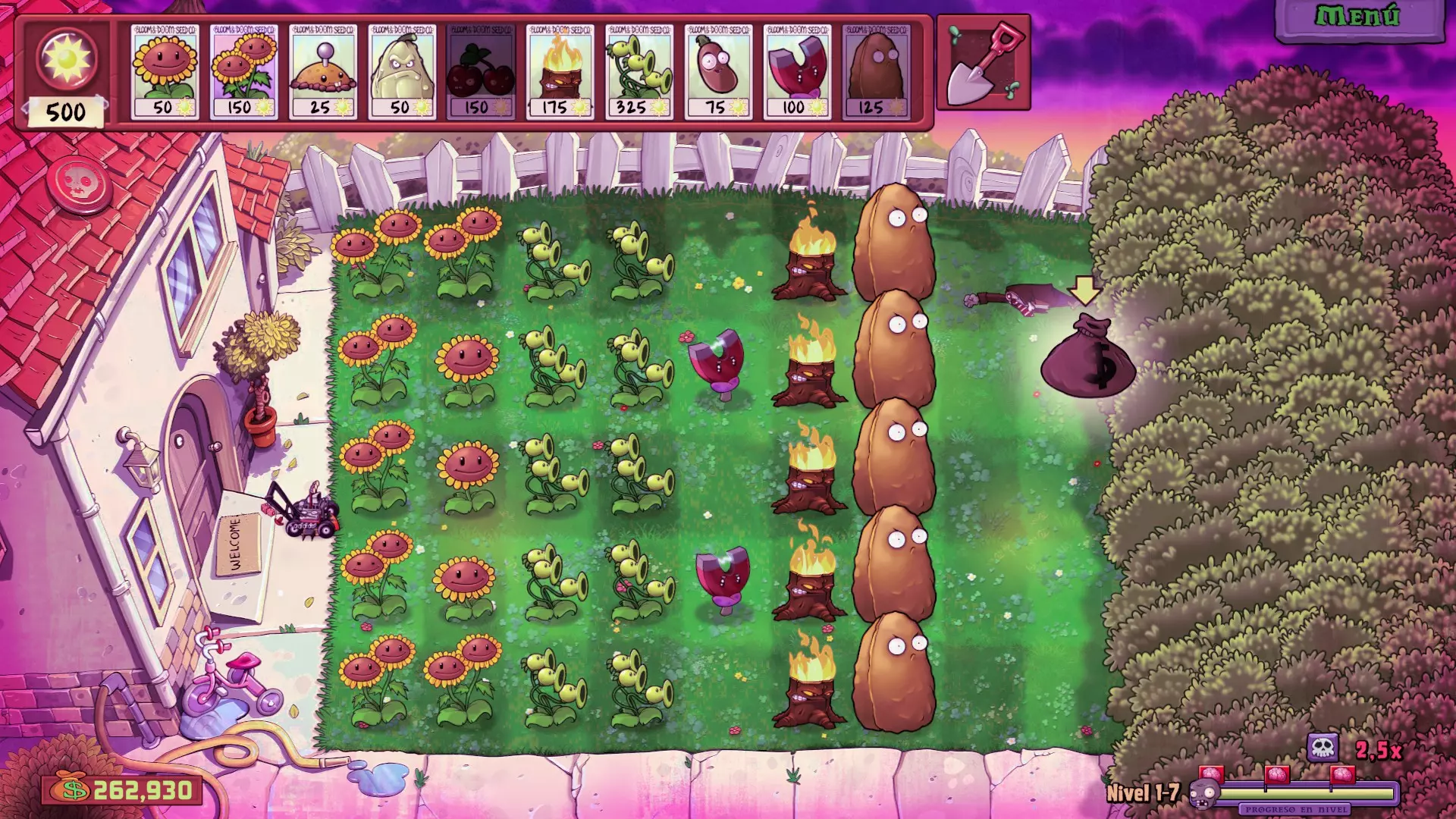 日间关卡 使用植物 阳光类:向日葵和双胞向日葵 辅助类:土豆地雷、地刺和樱桃炸弹 防御类:火炬树桩和三重射手 强化类:咖啡豆、磁力菇和火爆坚果 策略 其实这些关卡难度不算太高,先种植向日葵,并用辅助类植物保护花园。当你种好两行向日葵,最好再种上一些双胞向日葵(只要阳光足够就立即种植),然后在偶数行种植三重射手,之后在所有行种上火炬树桩。剩余的阳光用来补充三重射手,如果出现铁桶僵尸,就放置一些磁力菇。 重要提示:在有撑杆跳僵尸的关卡中,坚果是必不可少的。 目标花园