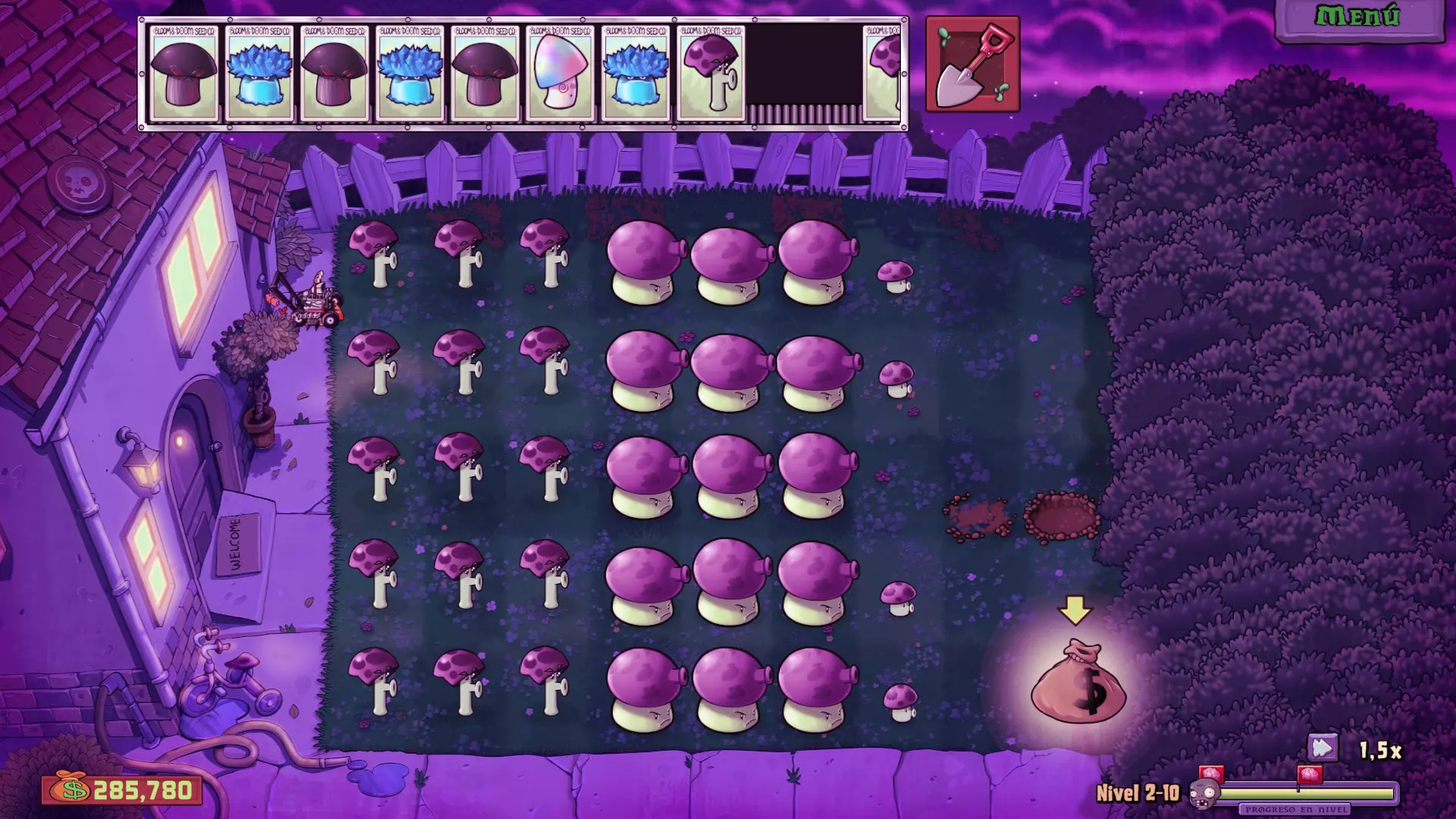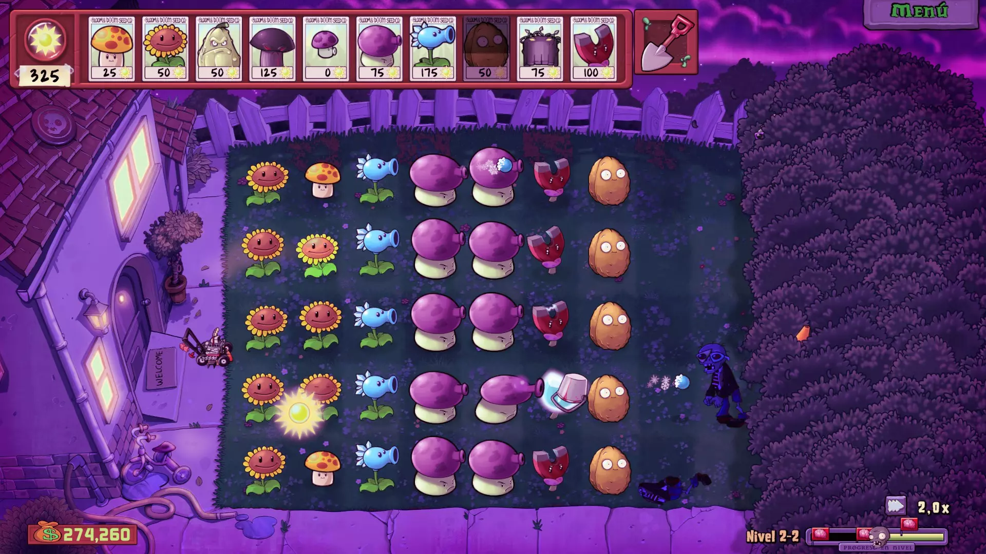 1-5关 如果不好好规划红坚果的使用,这一关可能会变得复杂。我的建议是先攒着红坚果,等关卡推进到更后面再用,因为如果早早用掉,后面可能会出现无法清理所有来袭僵尸的情况。 至于普通坚果,应该扔向最前面的僵尸,这不仅是因为任何失误都可能导致游戏结束,还因为这样通常能击中它身后更多的僵尸。 1-10关 这一关我的推荐阵容是:第一行种双发射手,第二行种寒冰射手,第三行再种双发射手,第5或第6行放置坚果。关于植物的种植,大家可以根据实际情况灵活安排,并且要在僵尸成群出现时使用樱桃炸弹。 夜间关卡 使用植物 阳光类:阳光菇和向日葵 辅助类:窝瓜和樱桃炸弹 防御类:小喷菇、烟雾菇和寒冰射手 强化类:坚果、高坚果和磁力菇 策略 阳光方面,先种一棵向日葵,然后种两个阳光菇,剩下的位置继续种向日葵。同时,用小喷菇进行防御。 接着开始种植寒冰射手(主要种在有铁桶僵尸或读报僵尸出现的行),并在最远处的墓碑旁种一些高坚果(因为随着关卡推进,这些墓碑会更难清除)。当我们种好所有寒冰射手后,再逐步种植烟雾蘑菇、坚果和磁力菇,根据实际需求增加数量。 在最后一波旗帜出现,所有僵尸都出来后,可以在正中间一行种上一个窝瓜,这样能快速结束战斗。 目标:花园