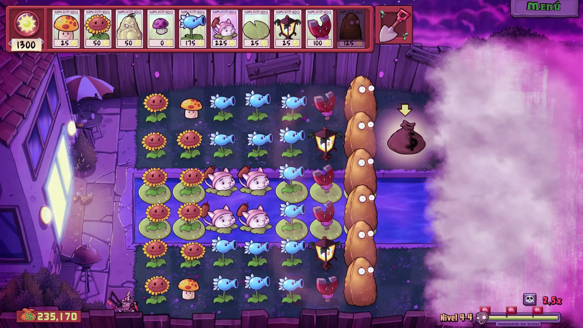 迷雾关卡 使用植物 阳光:阳光菇和向日葵 辅助植物:倭瓜 防御植物:毁灭菇、冰豌豆和香蒲 强化植物:睡莲、路灯花、磁力菇和坚果墙 策略 阳光获取采用与夜晚关卡相同的策略,先种植1个向日葵,接着种2个阳光菇,之后在种植毁灭菇的同时,其余位置继续种植向日葵。 当拥有5个向日葵后,停止种植向日葵,直到能放置1个香蒲。之后种完剩余的向日葵,并再放置1个香蒲。 接下来需要交替种植路灯花和磁力菇,尽量先在对应行种植冰豌豆(或坚果)来进行防御。我们会暂时放置坚果和香蒲,但优先要在每条线路都种上寒冰射手和磁力菇。重要提示:如果在选卡界面看到海豚僵尸在右侧,那么在放置第二个香蒲后再种泳池坚果。目标花园