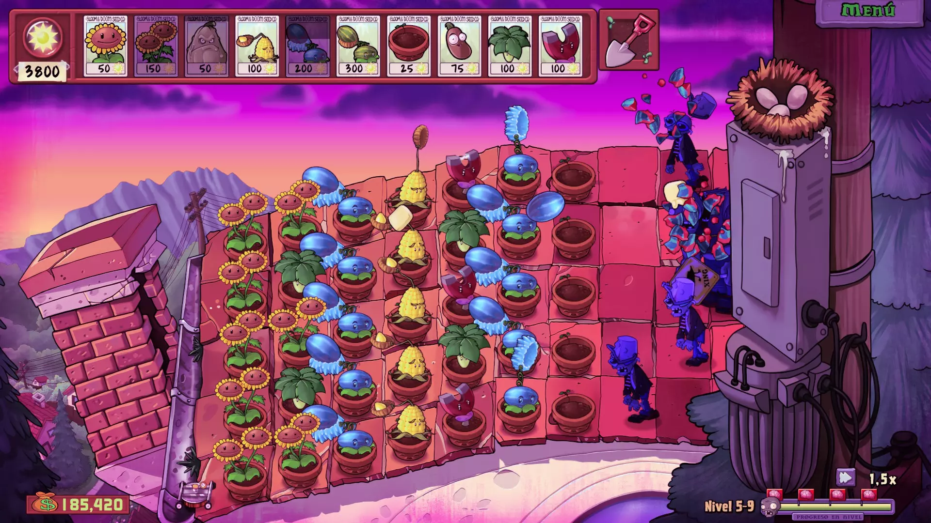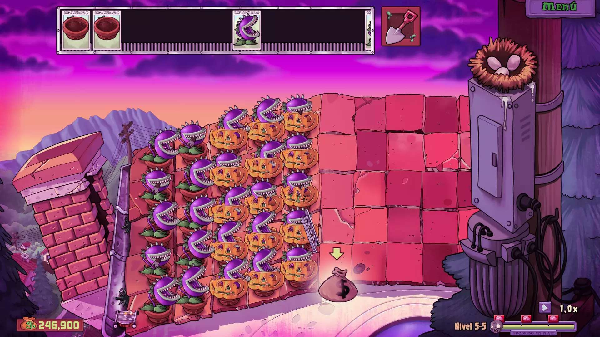 僵王博士 最后,有4件事需要注意: 1. 始终至少保留1个火爆辣椒和1个寒冰菇,以应对僵王博士发射的炮弹。 2. 当僵王博士弯腰并可以被攻击时,尝试用寒冰菇冻住他以造成更多伤害。如果有很多火爆辣椒,可以使用一些来攻击他,顺便清理可能存活的僵尸(记住,无论将火爆辣椒放在哪一行,都能对僵王造成伤害),但如果他还处于冰冻状态,不要使用火爆辣椒,因为这会立即解冻他。 3. 尽量在每一行至少放置一种游戏提供的三种投手类植物,但不要将西瓜投手放在最后,以免被投石车僵尸破坏。最后,每行始终保留一个空花盆,以便在出现问题时使用火爆辣椒(或用于寒冰射手)。这样就能完成关卡,如果没有损失任何割草机,还能获得成就。