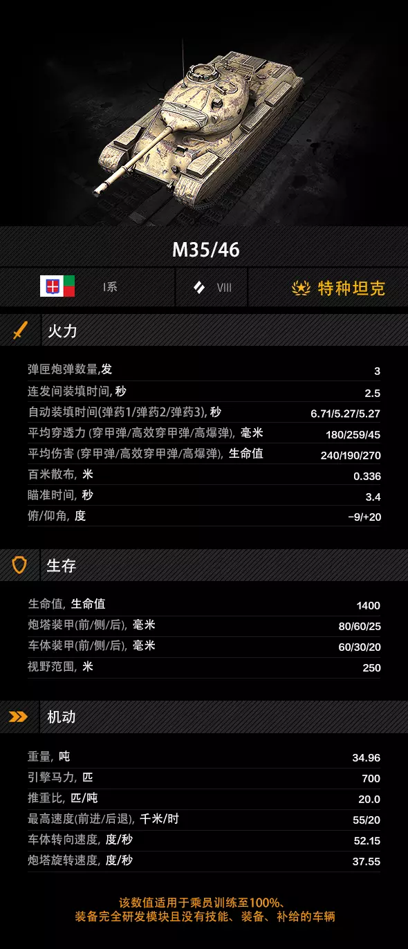 该车拥有55千米/时的前进极速与20千米/时的倒车极速,推重比为20.0马力/吨,具备出色的机动性。快速转场、抢占点位M35/46都能从容应对。车体转向速度为52.12度/秒,使其在对局中更加灵活。装甲防护并非其强项,更适合灵活运用机动攻击敌方侧翼,建议尽量减少正面接敌。
