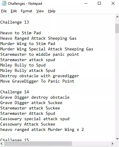这份指南最初只是一个记事本文件,我在里面简要记录了如何通关每个关卡的要点,以备我的朋友们在遇到挑战时向我求助。 我玩过的几乎所有其他游戏都有攻略,说实话,我一直也想制作一份。 为了照顾到不想被剧透的玩家,我把所有谜题策略都隐藏在了剧透标签后面。这样一来,如果你只想查看第31关的攻略,而不想看到第32关的内容,就不用担心会提前知道后续关卡的信息了。 不过到目前为止,我还没发现哪个谜题有两种完全不同的策略。如果有的话,欢迎告诉我。看看这两种玩法对比起来会有多有趣。 (作为参考,那些只要求“获胜”的挑战最让我感兴趣。这让我想到我们可以通过两种方式来完成“获胜”挑战,要么攻击核心,要么击败所有恐惧症。唉,事实并非如此,或者我就是个笨蛋。) 挑战1 本回合击败扭曲怪。你只能将罐式加农炮向西移动一定距离,所以尽可能将其移到最西边。 现在使用罐式加农炮,从那里攻击扭曲怪。 将重型兵移到刺激板上,提升重型兵的攻击力。 用重型兵攻击扭曲怪。 挑战2 本回合击败牛铃怪和罐式加农炮。将玛吉朝牛铃怪的方向一直往西移,直到紧挨着它。 用玛吉攻击牛铃怪。(位于巷口鳄鱼西南方向1格,狂暴莉娜西北方向1格) 用牛头怪攻击巷口鳄鱼或狂暴莉娜(牛头怪反正会同时击中它们俩) 将碎山之躯移至增益平台1(东北方向2格) 将神偷移至增益平台2(东北方向2格) 将土豆移至增益平台4(东南方向2格) 将重炮移至增益平台5(东方向1格) 用碎山之躯攻击巷口鳄鱼 用神偷攻击巷口鳄鱼 用土豆攻击狂暴莉娜 用重炮攻击狂暴莉娜 挑战18 本回合击败面团怪 将重炮向西南移动1格 用重炮攻击面团怪 将剃刀嘴向东北移动1格(位于面团怪西北方向正对面) 用剃刀嘴攻击面团怪 将芬尼根移至面团怪身后(向北东方向移动2格,位于Heavo的正西南方向) 用芬尼根的特殊攻击【血腥撕咬】攻击道泽尔。 用鼹鼠恶霸攻击道泽尔,持续2回合。 用凝视大师攻击道泽尔,持续2回合。 挑战19 本回合击败所有敌方恐惧症。将掘墓者移至永恒骑士处(向东1格)。 用掘墓者攻击永恒骑士。 用食火鸡攻击永恒骑士。(永恒骑士死亡时会将食火鸡吸到刺激板上) 用食火鸡的特殊攻击【尖啸爪击】攻击考贝尔。 将凝视大师移至最近的刺激板(向东南方向移动2格,位于掘墓者的正东方)。 用凝视大师攻击 Gesundheit。 将鼹鼠恶霸移至 Furkin Leeprecarn 处(向东北方向移动2格)。 用鼹鼠恶霸攻击 Furkin Leeprecarn。挑战20 本回合摧毁敌人核心 将【罐炮】向西北移动2格至最东侧恐慌点。 用【罐炮】攻击核心。 将【 Gesundheit】移动至最近的恐慌点(向东1格)。 用【 Gesundheit】攻击核心。 将【剃刀嘴】移动至最南侧恐慌点(向西南2格)。 将【K9000】移动至西北侧恐慌点(需两回合)。 将【 Heavo】移动至最西侧恐慌点(需两回合)。 挑战21 本回合击败所有敌方【恐惧症】 将【鼹鼠恶霸】移动至【 Finnigan】处(向东南2格)。 用【鼹鼠恶霸】攻击【 Finnigan】。 用【罐炮】攻击【 Furkin Leeprecarn】两回合。 将【杀戮之翼】移动至靠近【 Furkin Leeprecarn】的位置(向东2格)。 用【杀戮之翼】的特殊攻击攻击【 Furkin Leeprecarn】(蒙蒂)。将掘墓者向北移动2格至无人机处。 用掘墓者攻击无人机。 将罐子加农炮移动到最近的能量垫(无人机死亡处,向西2格)。 用罐子加农炮攻击诱惑者。 用钢炮邦佐攻击芬尼根。 对牛头怪使用钢炮邦佐的技能【哐当哐当】。 将牛头怪移动到剩余三个敌人的中心(向北2格)。 用牛头怪攻击任意敌人即可获胜。 挑战22 本回合击败所有敌方恐惧症 将掘墓者向东北移动1格。 摧毁掘墓者正东方的障碍物(位于绵羊毒气的东南方向)。 将牛铃移动到扭曲怪处(向东2格)。 用牛铃攻击扭曲怪。 将土豆怪向正东方移动1格。 用土豆怪攻击扭曲怪。 将绵羊毒气移动到剩余3个敌人的中心。(东南2格) 使用【绵羊毒气】的特殊攻击【噗!】击败所有剩余敌人。 挑战23 本回合用【格莱姆斯】击败【践踏先生】 将【掘墓者】移至最近的障碍物处(西北2格)。 摧毁【掘墓者】西北方向的障碍物。 用【食火鸡】的特殊攻击【嘎嘎猛爪】攻击【泰德】。 用【食火鸡】攻击【泰德】。 用【9号灵长类】的特殊攻击【坏猴子!】攻击【杀戮之翼】。 用【9号灵长类】攻击【杀戮之翼】。 将【诱惑者】向东北移动1格(位于【剃刀嘴】的西北方向)。 用【诱惑者】攻击【践踏先生】。 用【凝视大师】攻击【巴图拉】。 用【凝视大师】攻击【践踏先生】。 将【格莱姆斯】移至最近的【刺激垫】(西北2格)。 将【钢炮冈佐】向西南移动1格。 【钢炮冈佐】对【格莱姆斯】使用特殊能力【哐当哐当】。格林姆斯攻击践踏先生。 挑战24 本回合消灭所有恐惧症 将掘墓者移至凝视大师前方的障碍物处(东南1格) 摧毁凝视大师前方的障碍物(掘墓者正西南方) 凝视大师攻击K9000 凝视大师攻击牛铃 将永恒骑士移至K9000处(西南2格) 永恒骑士攻击K9000 碾压之山攻击剃刀嘴,持续2回合 挑战25 本回合粉碎敌人核心 将鼹鼠恶霸移至最西侧的刺激垫(向西2格) 鼹鼠恶霸攻击牛铃 将9号灵长类移至西侧恐慌点(向东2格) 将罐炮移至南侧恐慌点(东南2格) 罐炮攻击食火鸡 厌世者攻击扭曲怪,持续2回合 将 Gesundheit 移至北侧恐慌点(向南西方向移动2回合) 用【谋杀之翼】的特殊攻击(蒙蒂)攻击【食火鸡】。 将【谋