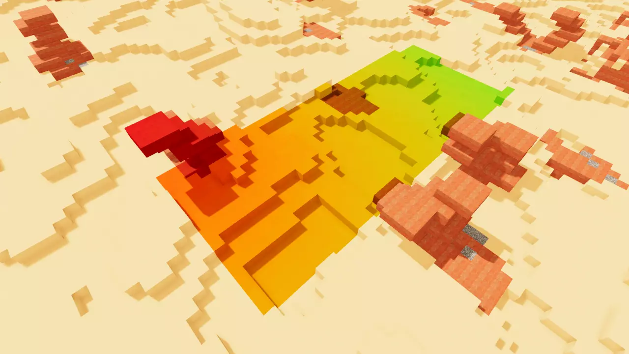 gradientx<red1><green1><blue1><red2><green2><blue2> 沿X轴(世界左右方向)从第一种颜色到第二种颜色为选定区域绘制渐变。 gradienty<red1><green1><blue1><red2><green2><blue2> 沿Y轴(世界自下而上)从第一种颜色到第二种颜色为选定区域绘制渐变。 gradientz<red1><green1><blue1><red2><green2><blue2> 沿Z轴(世界自后向前)从第一种颜色到第二种颜色为选定区域绘制渐变。 rotate<degrees> 将选定区域旋转指定的度数。请注意,除非选择90、180或270度,否则效果会很怪异。旋转:选取指定区域并将其围绕圆形旋转,生成3个额外区域以组成一个正方形。这有助于更快地创建特定物体,例如喷泉、树木等。
