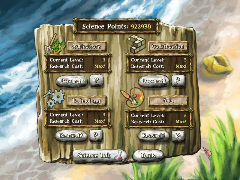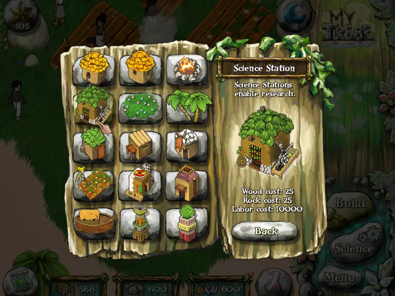 准备就绪后,请尽快建造科学站。注意:无需高人口。 科学站在游戏初期乃至后期都极为重要。科学站能让部落成员学习科学技能并获取科学点数,还能用来制作药水。积累足够的科学点数至关重要,因为这能让你研究不同的领域,例如农业、建筑、科技和艺术。