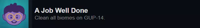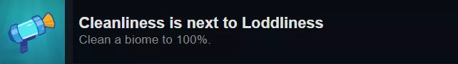 你可以通过推进剧情来完成该成就。你只需将每个生物群系清理至100%一次,即使之后它们的清洁度下降也不会影响成就。 如果清理生物群系时遇到困难,记得长按F键来显示黏菌、垃圾等隐藏物品的位置。 在深水区