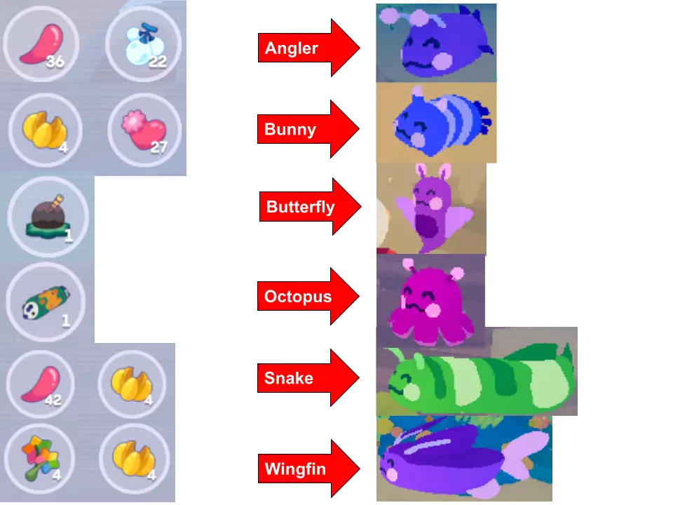 你需要在同一个存档文件中拥有所有这些。我截图中的水果数量没有任何意义。我给我的洛德尔喂食的每种水果数量大致相同,普通水果喂了约3个,双份水果喂了约4-5个。所有清洁者进化形态