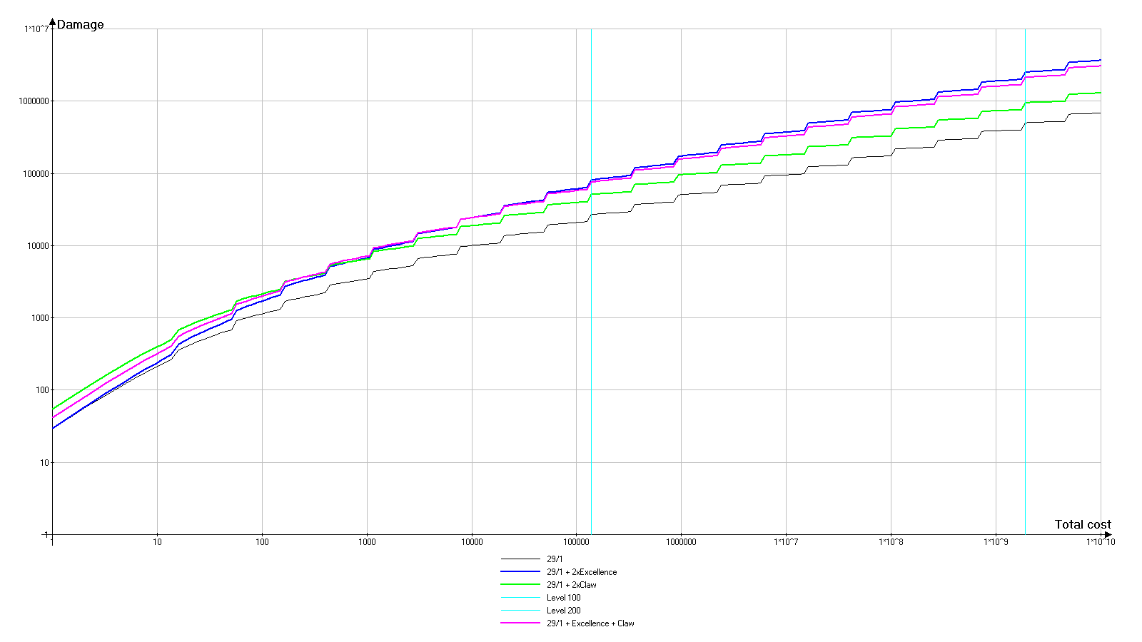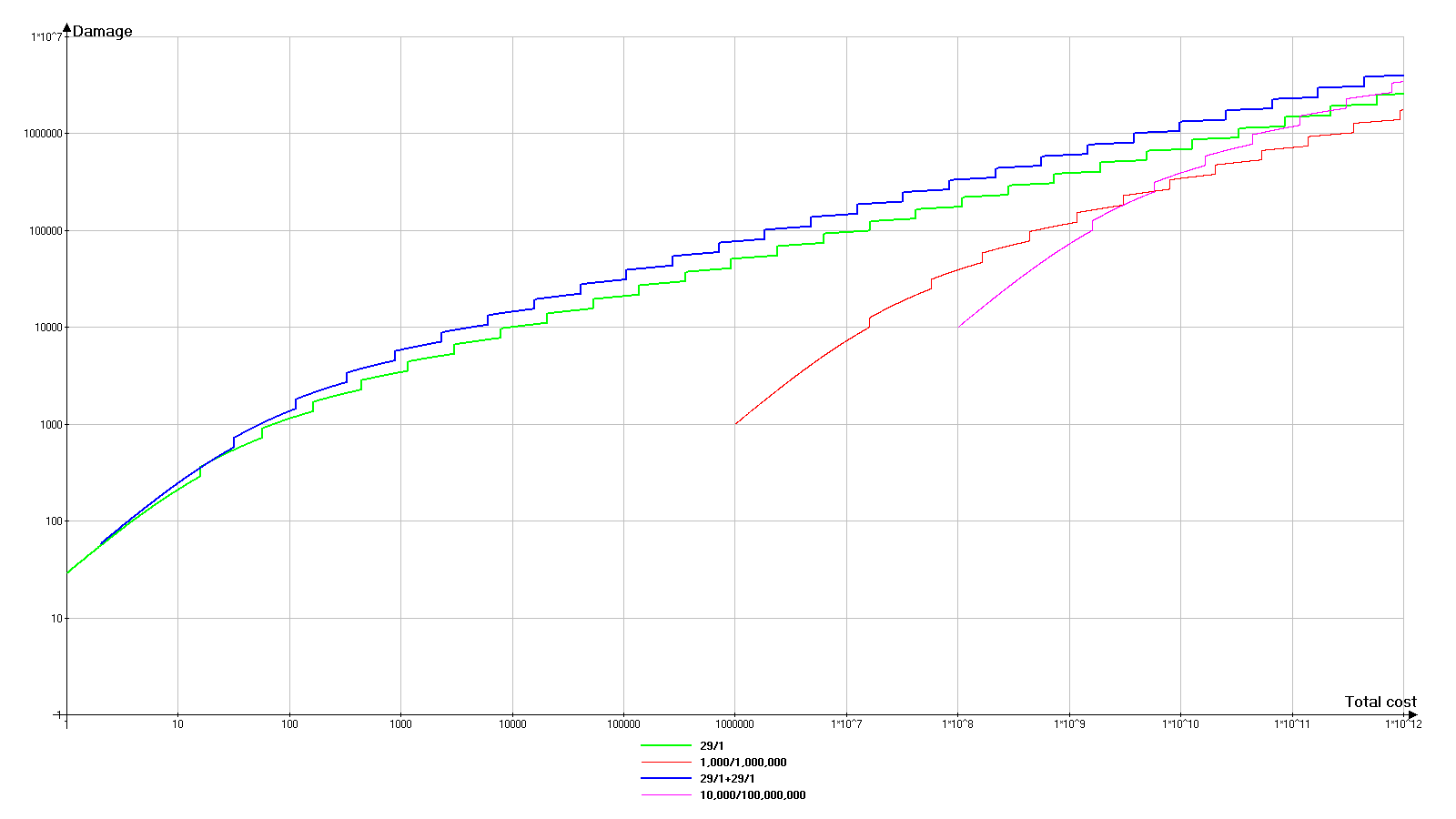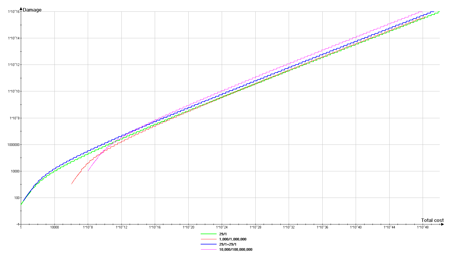 幸运的是,游戏一开始就会给予无名匕首。不过我们稍后再对其进行详细介绍。 每件武器都有3个影响游戏玩法的主要特性: - 基础伤害:武器在1级且无任何其他加成时的伤害。 - 基础费用:将武器升级到1级所需的费用。它由基础伤害值(不包含任何修改或外部效果)决定,初始等于该数值的平方。 - 品质:影响通过“附魔”可插入武器的宝石数量以及部分宝石效果的数值。 同时,提升武器等级时需遵循以下规则: - 每提升10级,武器会获得额外伤害。 - 每次升级都会增加下一次升级的费用。0级武器即使装备也不会对游戏产生影响(如同完全不存在)。 当前武器伤害显示在已装备武器图标的右下角。 提升武器等级1级的花费显示在已装备武器图标的左下角。 2. 后台计算方式(无外部加成) D - 武器基础伤害。在武器 tooltip 窗口顶部显示为【基础伤害】。 C - 武器基础花费。在武器 tooltip 窗口顶部显示为【基础花费】。在无外部加成影响的情况下:C=D² TRUNC(X) - 截断函数,即舍去数字X的小数部分,只保留整数部分。例如:TRUNC(1.6)=1,TRUNC(5.2)=5 L - 当前武器等级。 D(L) - 等级L时的当前武器伤害。武器每提升10级,获得25%的额外伤害(乘法加成)。 D(L)=D*L*1.25^TRUNC(L/10) C(L) - 当前等级为L的武器提升1级所需的成本。 C(L)=C*1.1^L Ctotal(L) - 将武器等级从0提升到L级的总成本。它是所有等级提升成本的总和,即在此情况下为等比数列的总和。对于我们的特定情况,公式如下: Ctotal(L)=10*C*(1.1^L-1) 但这能给我们带来什么?下一部分将对此进行说明。 3. 分析 为了更好地理解情况,我们将绘制图表。首先需要了解的是,由于数值极大,图表沿对数轴绘制,因此比例是非线性的。 现在让我们来看图例。因为每次都写“基础伤害/基础价值”太过繁琐,所以武器命名遵循“X/Y”原则,其中X代表基础伤害,Y代表基础成本。 29/1(绿色图表)——基础低伤害低成本武器。稍后我会解释为何选择这些数值。 1,000/1,000,000(红色图表)——中等层级武器。比较一般,但添加进来用于对比。 29/1 + 29/1(蓝色图表)——两把同等升级的第一类武器。 10,000/100,000,000(品红色图表)——高伤害极高成本武器。