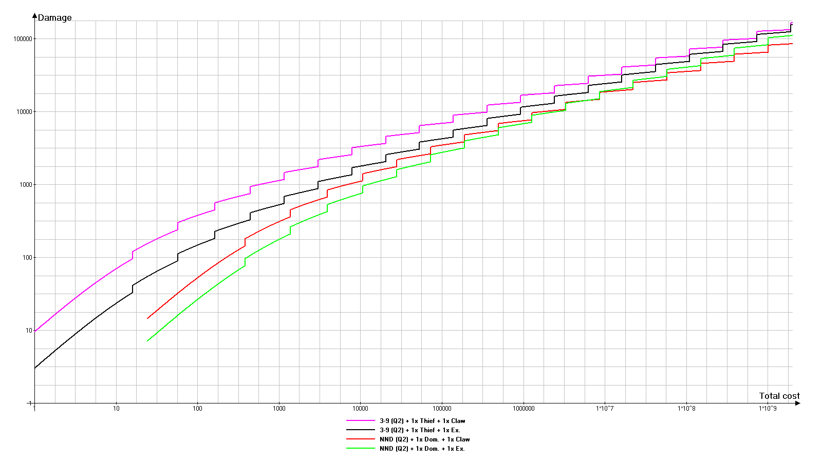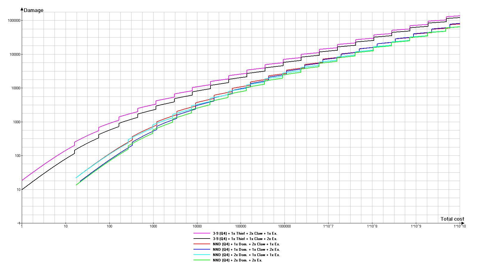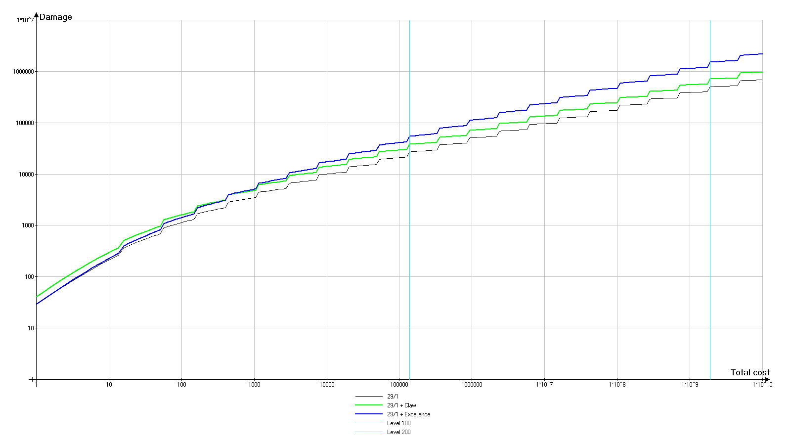 幸运的是,游戏一开始就会给予无名匕首。不过我们稍后再对其进行详细介绍。 每件武器都有3个影响游戏玩法的主要特性: - 基础伤害:武器在1级且无任何其他加成时的伤害。 - 基础费用:将武器升级到1级所需的费用。它由基础伤害值(不包含任何修改或外部效果)决定,初始等于该数值的平方。 - 品质:影响通过“附魔”可插入武器的宝石数量以及部分宝石效果的数值。 同时,提升武器等级时需遵循以下规则: - 每提升10级,武器会获得额外伤害。 - 每次升级都会增加下一次升级的费用。0级武器即使装备也不会对游戏产生影响(如同完全不存在)。 当前武器伤害显示在已装备武器图标的右下角。 提升武器等级1级的花费显示在已装备武器图标的左下角。 2. 后台计算方式(无外部加成) D - 武器基础伤害。在武器 tooltip 窗口顶部显示为【基础伤害】。 C - 武器基础花费。在武器 tooltip 窗口顶部显示为【基础花费】。在无外部加成影响的情况下:C=D² TRUNC(X) - 截断函数,即舍去数字X的小数部分,只保留整数部分。例如:TRUNC(1.6)=1,TRUNC(5.2)=5 L - 当前武器等级。 D(L) - 等级L时的当前武器伤害。武器每提升10级,获得25%的额外伤害(乘法加成)。 D(L)=D*L*1.25^TRUNC(L/10) C(L) - 当前等级为L的武器提升1级所需的成本。 C(L)=C*1.1^L Ctotal(L) - 将武器等级从0提升到L级的总成本。它是所有等级提升成本的总和,即在此情况下为等比数列的总和。对于我们的特定情况,公式如下: Ctotal(L)=10*C*(1.1^L-1) 但这能给我们带来什么?下一部分将对此进行说明。 3. 分析 为了更好地理解情况,我们将绘制图表。首先需要了解的是,由于数值极大,图表沿对数轴绘制,因此比例是非线性的。 现在让我们来看图例。因为每次都写“基础伤害/基础价值”太过繁琐,所以武器命名遵循“X/Y”原则,其中X代表基础伤害,Y代表基础成本。 29/1(绿色图表)——基础低伤害低成本武器。稍后我会解释为何选择这些数值。 1,000/1,000,000(红色图表)——中等层级武器。比较一般,但添加进来用于对比。 29/1 + 29/1(蓝色图表)——两把同等升级的第一类武器。 10,000/100,000,000(品红色图表)——高伤害极高成本武器。
