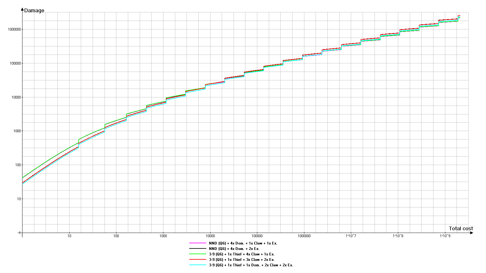 品质6: NND的基础成本终于降至1。此时所有悬念都消失了。各条曲线紧密交织,几乎难以区分彼此。若放大图表的最后部分,会发现3/9武器的所有3种方案曲线都位于NND两种方案曲线之间。既然它们几乎没有差别,那么升级3/9武器还有意义吗? 但这一切都只是理论层面的分析。实际情况又会如何呢? 在实际游戏中,需要考虑新手获取资源的难度——包括材料和石头。石头不会凭空出现,金属也不会长在树上。同时,如果你想获得基础成本为1的NND,那么你就无法将当前拥有的所有东西都插进去。重要的是要记住,首要目标是带有4颗支配之石的品质6级NND。这意味着可以插入其他宝石,但前提是必须始终留有足够的空插槽来插入最多4颗支配之石。 我进行了一次测试。在第一个星系完成碎片1后,我得到了一把品质6级的NND,其中我插入了2颗支配之石(其中一颗是在黑蜡商店用碎片购买的)。让我们将这把武器与3/9匕首进行比较。