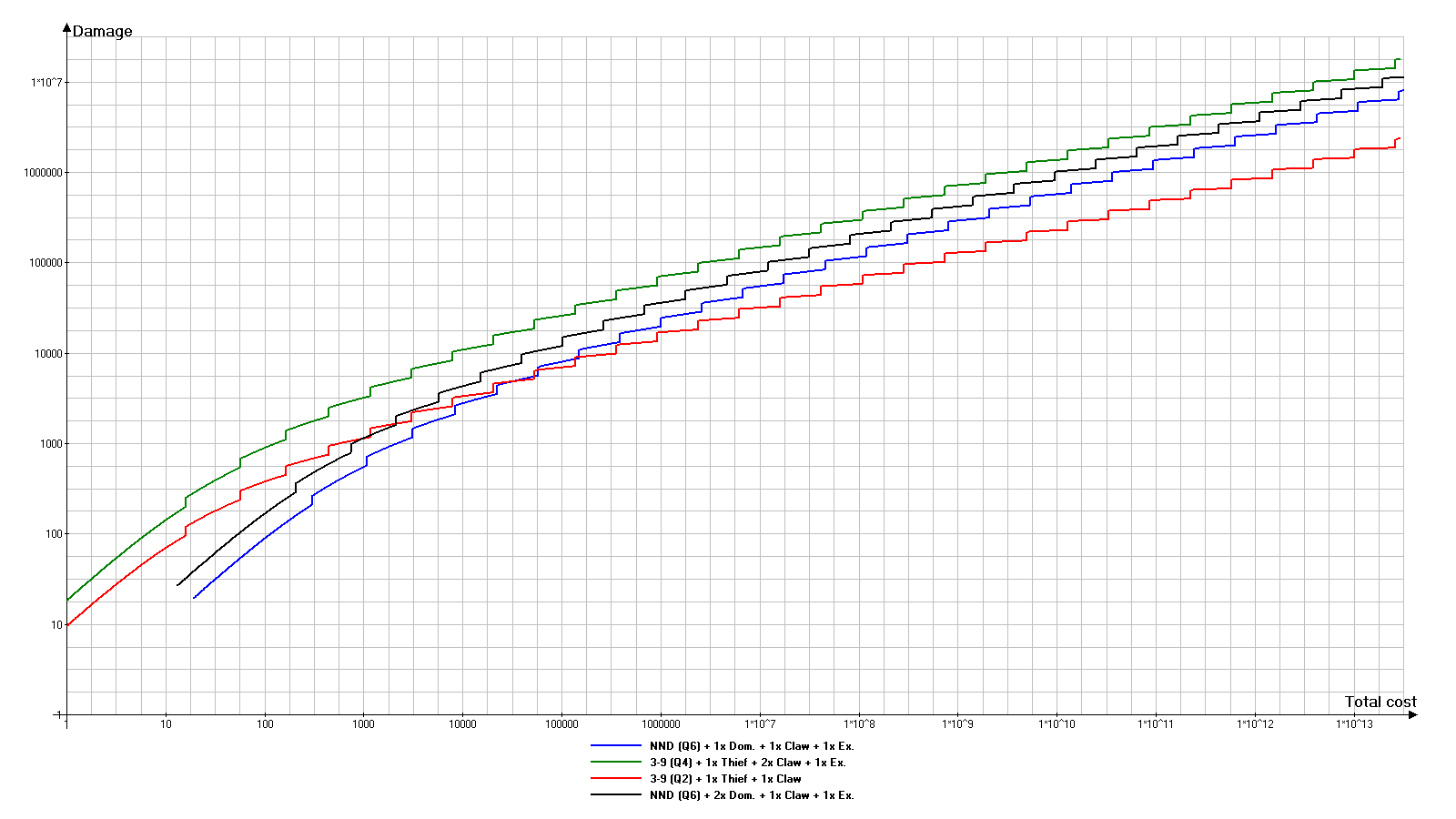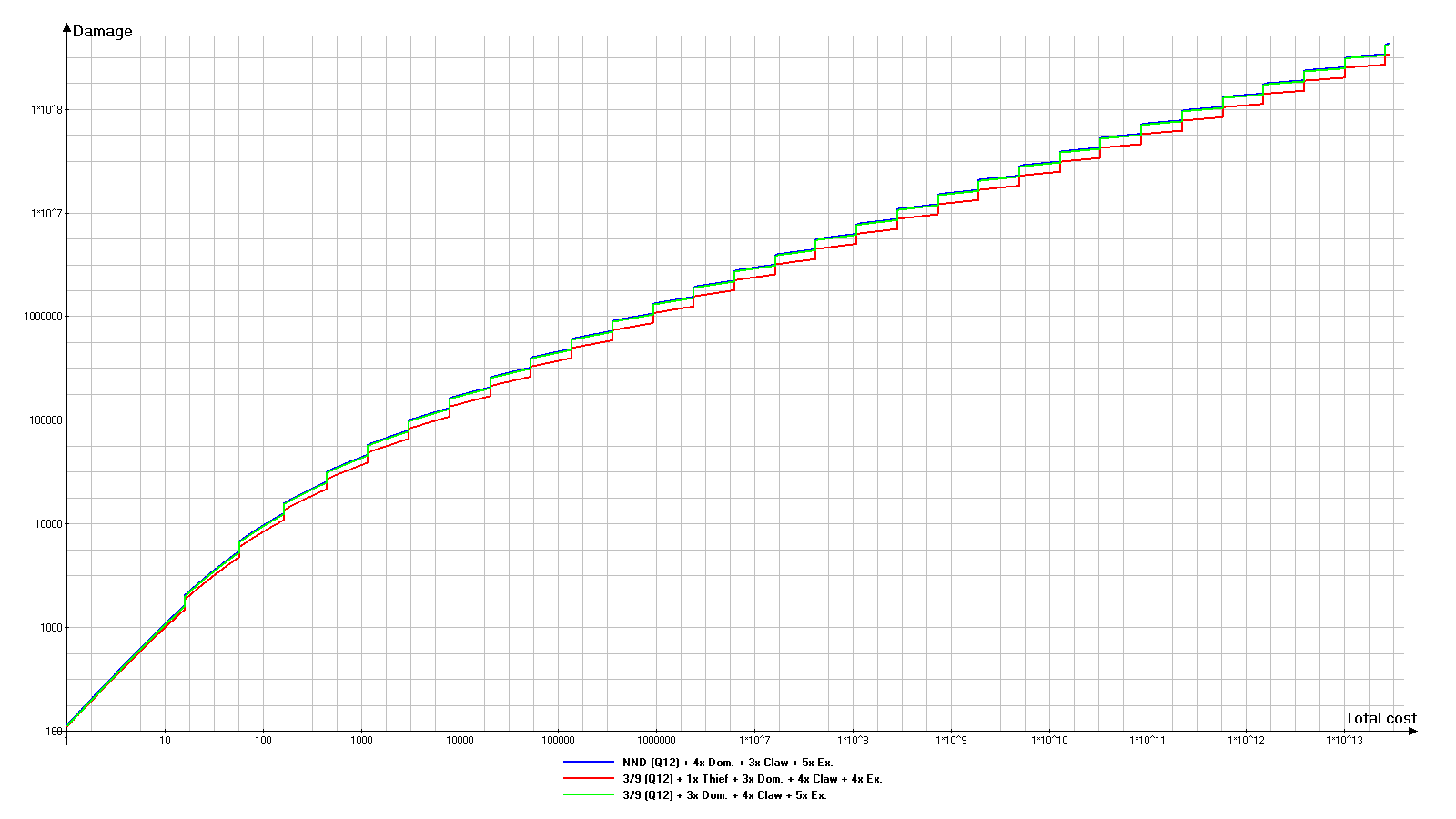 为了进行对比,我选取了品质12的最佳3/9匕首并镶嵌1颗盗贼之石,又测试了未镶嵌盗贼之石的更强组合,然后将结果与上一部分提到的品质12的新手友好型NND进行比较: 品质12且镶嵌1颗盗贼之石的最佳3/9匕首(红色图表)仍需使用支配之石。这种情况下,镶嵌1颗盗贼之石似乎是无意义的操作。 未镶嵌盗贼之石的品质12最佳3/9匕首(绿色图表)比之前的版本性能提升约16-18%。 上一部分的NND(蓝色图表)几乎被绿色图表覆盖,因为两者数值非常接近。 但随后我意识到了自己的错误:我一直都找错了方向。3/9匕首搭配盗贼之石的主要优势在于能非常早期获得基础价格为1的武器。 注意: 以下所有图表均展示了3/9武器特定品质下的最佳宝石组合。 对于NND(原词),假设我们很早就找到了3/9匕首——正好是最需要它的时候。但在游戏初期,找到4颗支配之石并不容易,因此对于品质2,我们认为只找到了1颗支配之石,而对于品质4,我们找到了1-2颗支配之石。