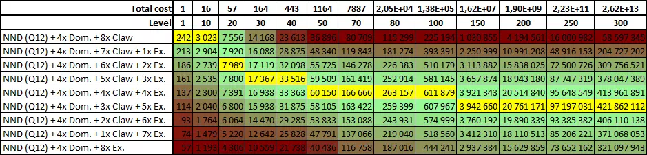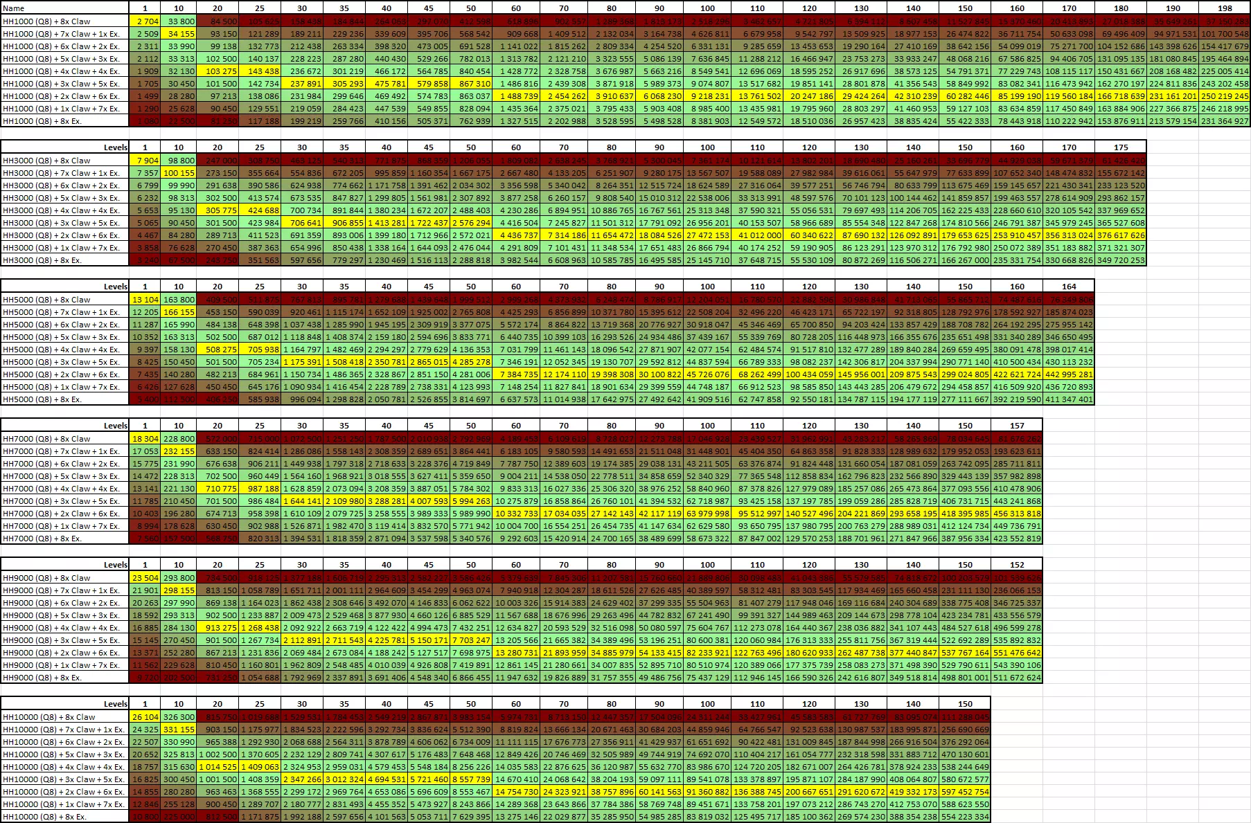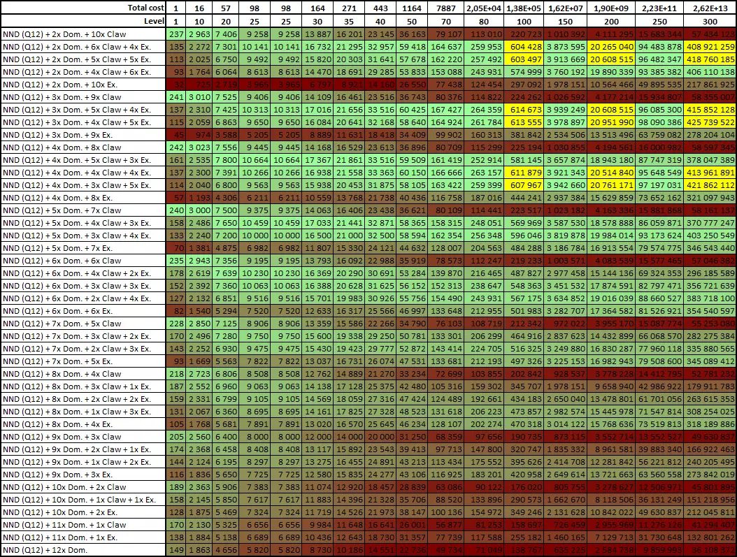 为简洁起见,我将为你展示等级100、200和300时的前6种组合。 武器 等级 等级100 等级200 等级300 NND(Q12)+3x支配石+4x利爪石+5x卓越石 第2名 第1名 第1名 NND(Q12)+4x支配石+3x利爪石+5x卓越石 第4名 第2名 第2名 NND(Q12)+3x支配石+5x利爪石+4x卓越石 第1名 第3名 第4名 NND(Q12)+2x支配石+5x利爪石+5x卓越石 第6名 第4名 第3名 NND(Q12)+4x支配石+4x利爪石+4x卓越石 第3名 第5名 第5名 NND(Q12)+2x支配石+6x利爪石+4x卓越石 第5名 第6名 第6名 进一步简化结论:如果在带有4颗支配石的NND上添加3颗利爪石和5颗卓越石,那么我们将得到一把在任何等级的伤害排名中都名列前茅的武器。它不是最佳武器,但非常接近(在品质12的NND中)。. 新手友好选项。 如果你想要更好的效果,并且准备好使用极其稀有的【矿石提取工具】(见下方说明),那么可以选择消耗3个【支配之石】、4个【利爪之石】和5个【卓越之石】的选项。不过,这样做毫无意义(见下文)。 即使品质达到15,宝石分布大致均衡的组合也占据领先地位。4/5/6和5/4/6的组合(伤害完全相同)并列第一,5/5/5的【支配之石】/【利爪之石】/【卓越之石】组合位居第二。 更新: 0.64c补丁后,【矿石提取工具】不再是稀有资源(详情见“更新”部分2020年10月1日的说明)。但它仍然需要花费44个碎片,这仍然是一笔不小的数目。在花费碎片时要三思,因为每次购买都会减缓碎片商店中升级的获取进度。 更新2: 我制作了一个谷歌文档表格,可根据给定的品质、基础伤害和等级计算最佳的宝石组合。你可以编辑黄色单元格(品质和基础伤害),但由于这是公开表格,其他人可能会干扰你的编辑,因此建议你自行下载一份副本:“文件”->“下载”->选择格式(最可能是XLSX)。对于每个等级范围,单元格颜色越接近绿色表示组合越好,而最高伤害的组合始终会标为黄色(以便快速找到)。和往常一样,我们最关注基础消耗为1的情况(这就是为什么如果基础消耗高于1,早期行是空的)以及等级100及以上的情况。 9. 多宝石武器(“重击者”部分) 简单来说:目前不值得使用。 我时不时会尝试想出一种方法,让重型武器能稳定占据一个装备槽位。但每次都找不到合适的方法。有一些有趣的机制,但它们没有按预期(或者至少没有按描述中所写的那样)发挥作用。因此,目前我不推荐使用重型武器。 在某些时候,你会找到一把基础伤害非常高的武器。高到可以称之为“大家伙”。但在我们的例子中,我会称之为“重击者”(简称“HH”)。但值得保留它吗?在使用“强力打击者”的整个过程中(考虑到进度重置,时间并不长),我从未见过它在NND等级低于300时超过107级——即便是在进行有大量黑蜡升级的farm runs期间。假设这是由于我在星座和碎片商店的升级不足所致。我们将基于以下条件对抽象的“强力打击者”武器进行计算: 我们有一把品质8的武器(只是因为我们需要有个追求目标,而且8这个数字不算太大,不至于需要积攒数年资源才能升级)。 基础伤害为10000(只是因为我们在上面的例子中已经使用过这个数值)。 这把武器可以升级到150级。同时,我们通过自动升级功能来提升两把武器(NND和HH)的等级(这意味着它们会轮流升级,每次升1级)。 但与此同时,要找到一把真正强力的武器太难了。随机机制就像个脾气暴躁的捣蛋鬼,所以我们来看看几把基础伤害值不同的武器: 1000基础伤害,1000000基础成本(又称“HH1000”) 3000基础伤害,9000000基础成本(又称“HH3000”) 5000基础伤害,25000000基础成本(又称“HH5000”) 7000基础伤害,49000000基础成本(又称“HH7000”) 9000基础伤害,81000000基础成本(又称“HH9000”) 10000基础伤害,100000000基础成本(又称“HH10000”) 那么魔法石的情况如何呢? 在如此高的基础伤害值下,支配之石的效果简直离谱。我做了一些计算——这块石头根本不值得费力去获取。 爪之石(除了对基础伤害的提升更加微不足道外)还能提供20%的总伤害加成。 卓越之石正如其描述的那样生效——无论使用何种武器。 温柔之石只是降低升级成本。短期内效果还行,但长期来看很糟糕,因为升级成本会变得极高。而且每多一块温柔之石,就意味着少一个插槽来放置其他石头。 所以,如果我们假设一把基础伤害为10000的武器可以升到150级,这意味着我们需要获得数量极其庞大的红宝石。但对于其他类型的武器,用同样数量的红宝石,能提升的等级数是不同的。因此,所有计算均考虑了红宝石的最大可用数量。