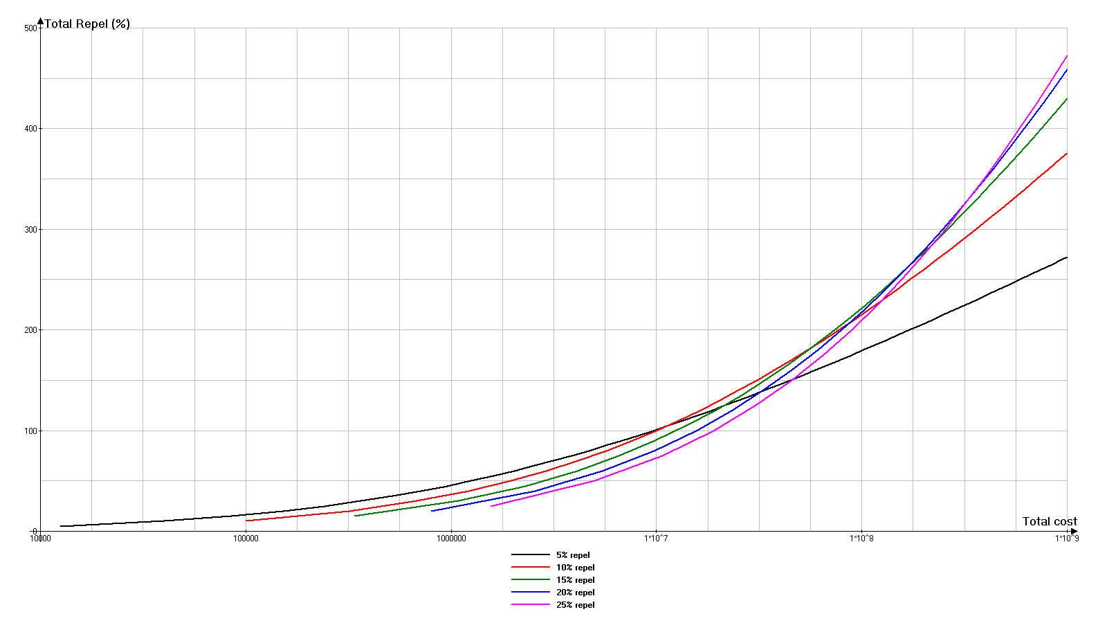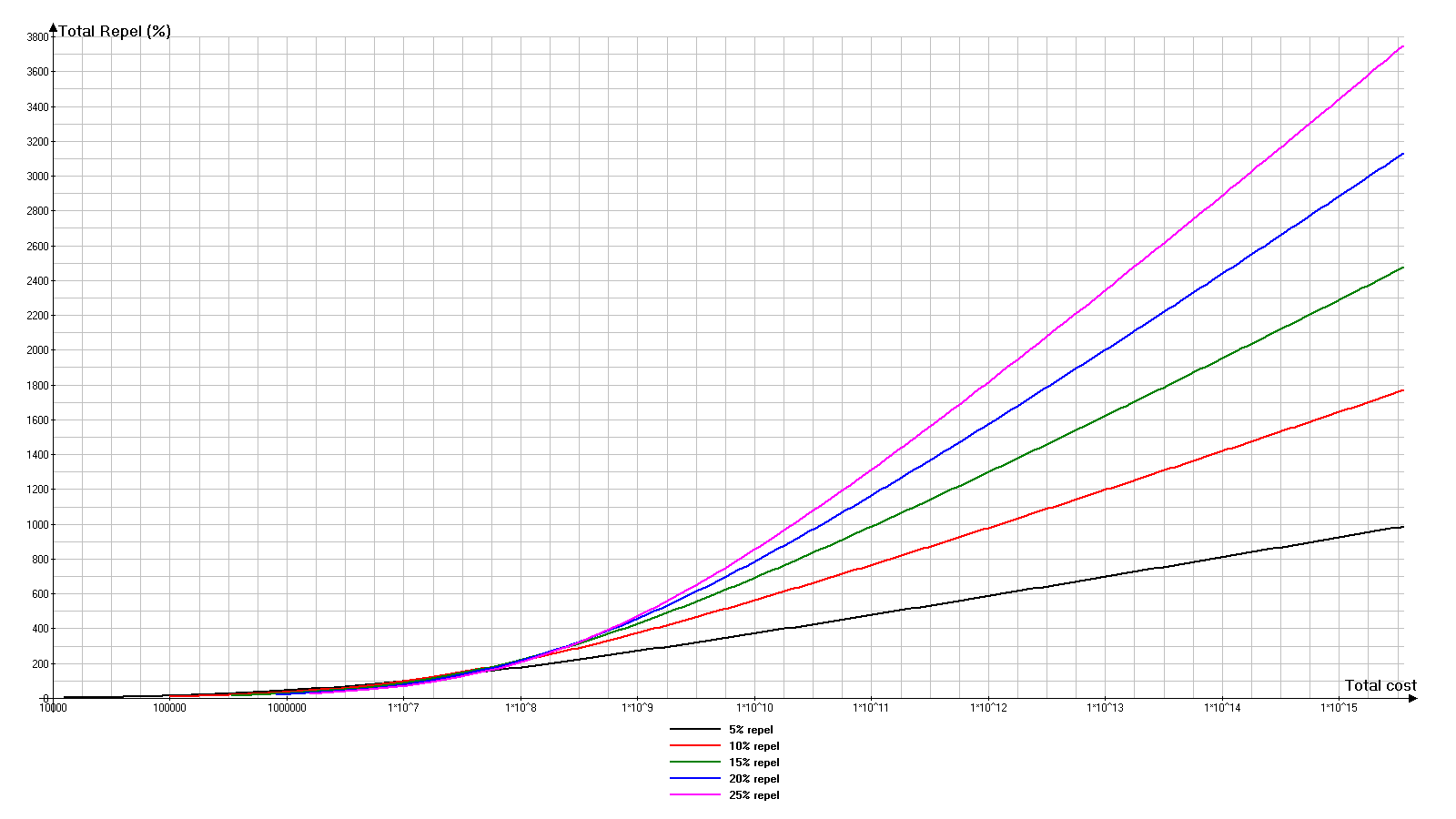 说实话,我不确定是否需要在本指南中加入盾牌相关内容。它们与武器有一些共同点,但机制却完全不同。不过和武器一样,图表能帮助你看清整体情况。而如果不在这里,又能在哪里插入带图表的信息呢? 我花了很长时间试图弄清楚盾牌等级提升的成本公式。我看到其中存在某种规律,但始终缺少关键部分来理解具体是哪种规律。最终,通过联系开发者才解决了这个问题。 R代表基础击退伤害(百分比)。在盾牌 tooltip 窗口顶部显示为【基础击退】。为了避免产生误解,我直接说明:当提到基础击退为10%时,意味着R=10(数值以百分比计)。不要将百分比转换为分数。 C - 基础护盾成本。在武器工具提示窗口顶部显示为【基础成本】。在不受外部修饰符影响的情况下: C=100*R^3 目前游戏中只有5种护盾类型。不要被物品图标上的图片误导:护盾仅在基础击退值上有所不同。 代号 基础击退 基础成本 R-5 5% 12500 R-10 10% 100000 R-15 15% 337500 R-20 20% 800000 R-25 25% 1562500 注意: 从护盾引入游戏开始到0.72版本,游戏存在一个视觉故障。如果角色拥有任何直接提升所有武器基础伤害的效果(例如“ blade mastery”技能、蛇形印记中的第1音节等),那么在盾牌工具提示的“基础反弹”一栏中,反弹值会不合理地高于实际数值。此问题已在0.72版本中修复,因此任何基础反弹超过25%的截图均拍摄于修复之前。 L-当前盾牌等级。 R(L)-等级L时的当前总反弹值。 R(L)=R*L C(L)-当前等级为L的盾牌提升1级所需的成本。 C(L)=C*(1+L)*(1.1^L) Ctotal(L)-将盾牌等级从0提升至等级L的总成本。即所有等级升级成本的总和。与武器不同,提升护盾等级1级的成本公式要复杂得多,所以我无法得出总成本的最终公式。我不得不在Excel中进行计算,并通过数据点绘制图表。 我很难决定计算到哪个等级,所以我选择了最贵的护盾(基础击退率25%)的150级。这个选择是随机的,但事实证明是正确的。 由于数值极大,“总成本”是沿对数轴绘制的,因此比例是非线性的。但“总击退率”使用的是线性轴。