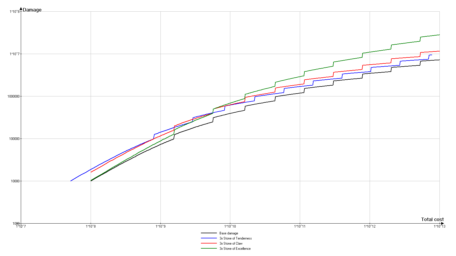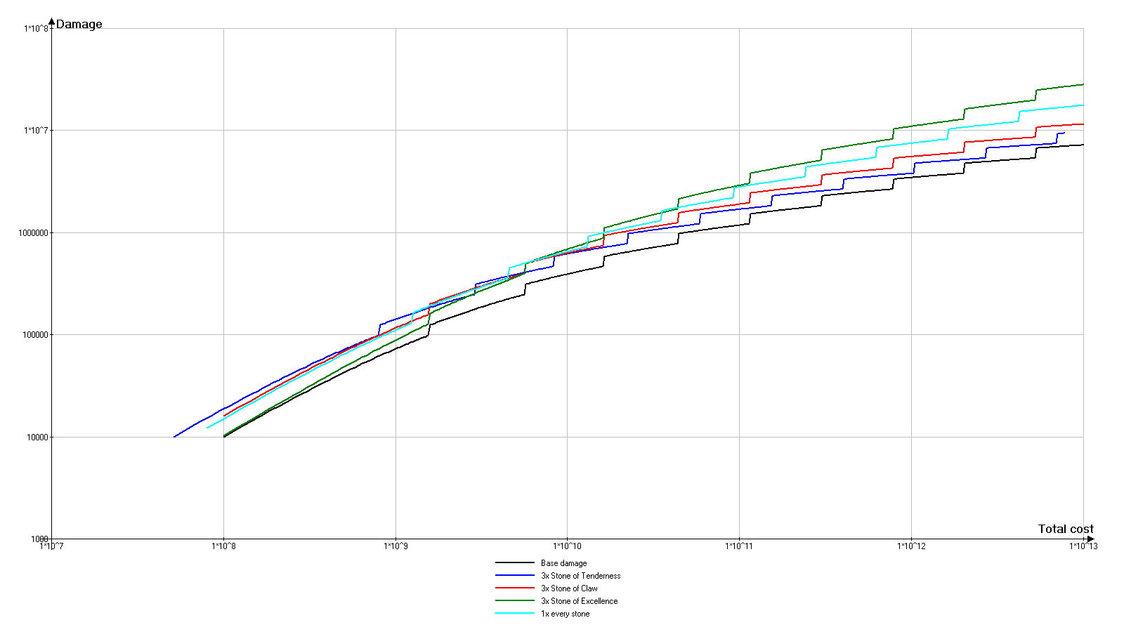 上图中同时显示了过多的图表,但有一点很明确:浅蓝色图表(代表仅使用卓越之石的武器)明显低于其他许多图表。那么问题出在哪里呢?实际上,当仅使用卓越之石时,武器的基础伤害最低。而当仅使用利爪之石时,武器的伤害成长最低。只有将这两种效果组合使用,才能获得最佳结果。