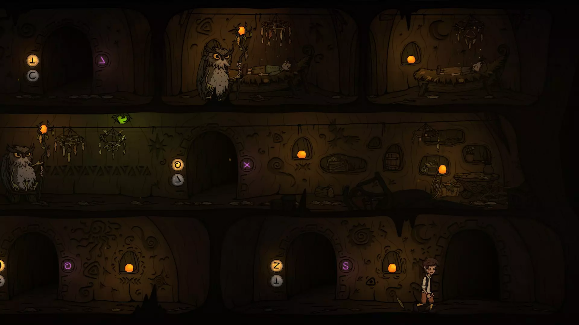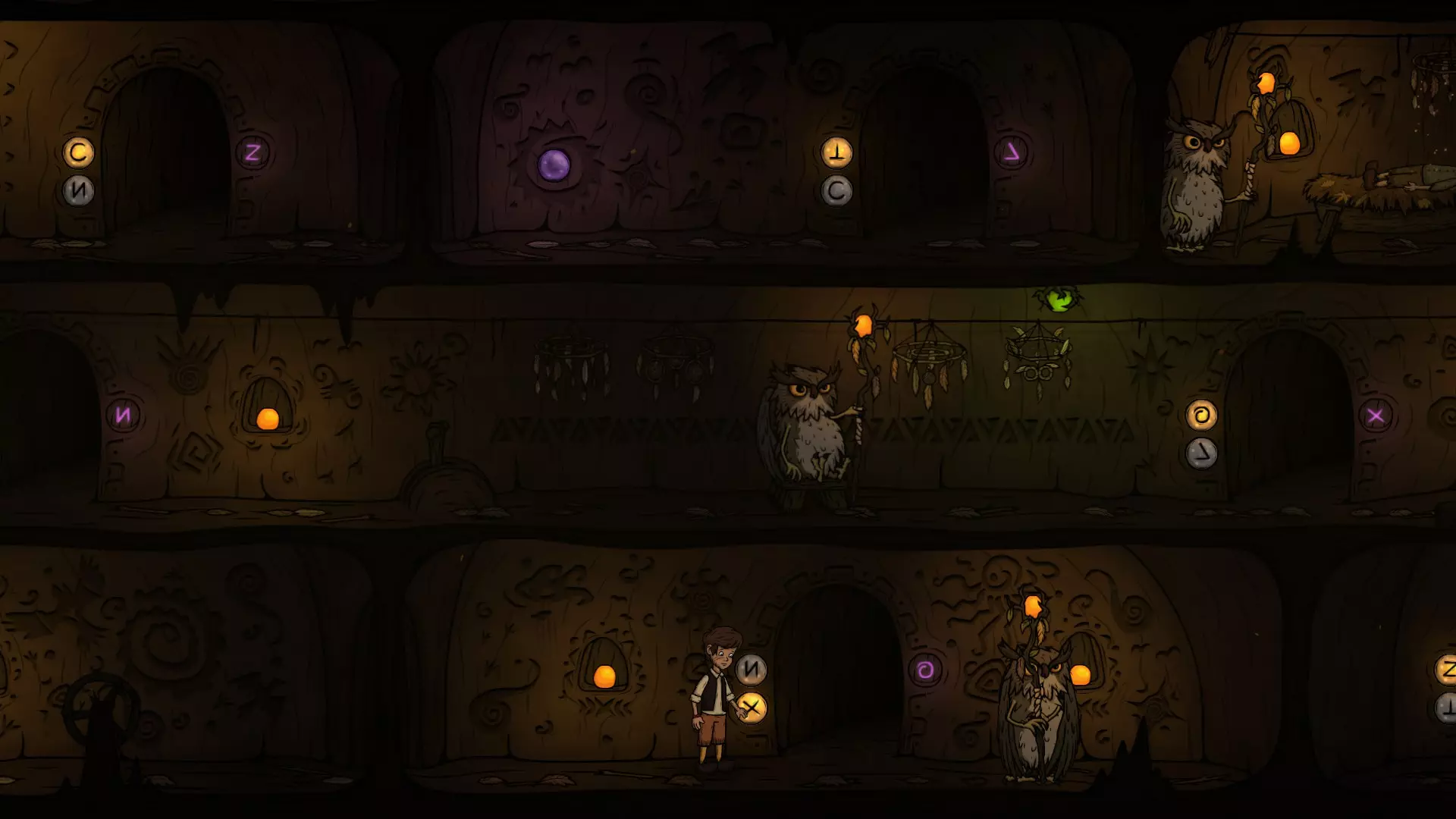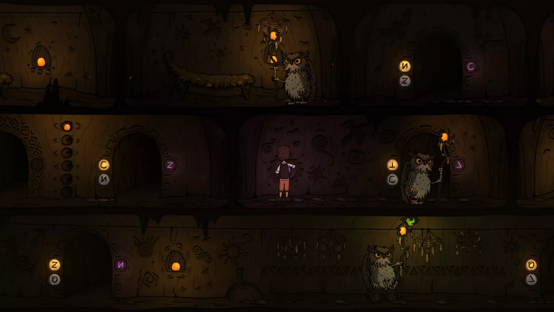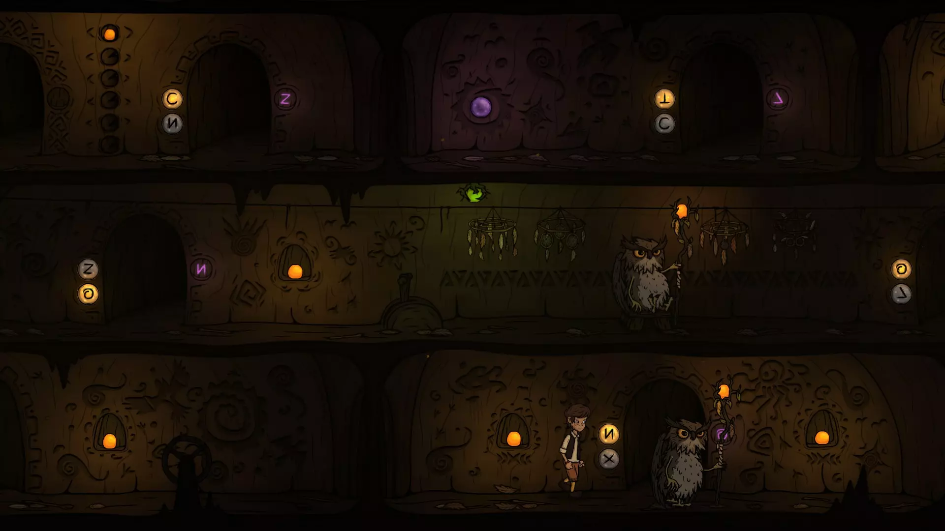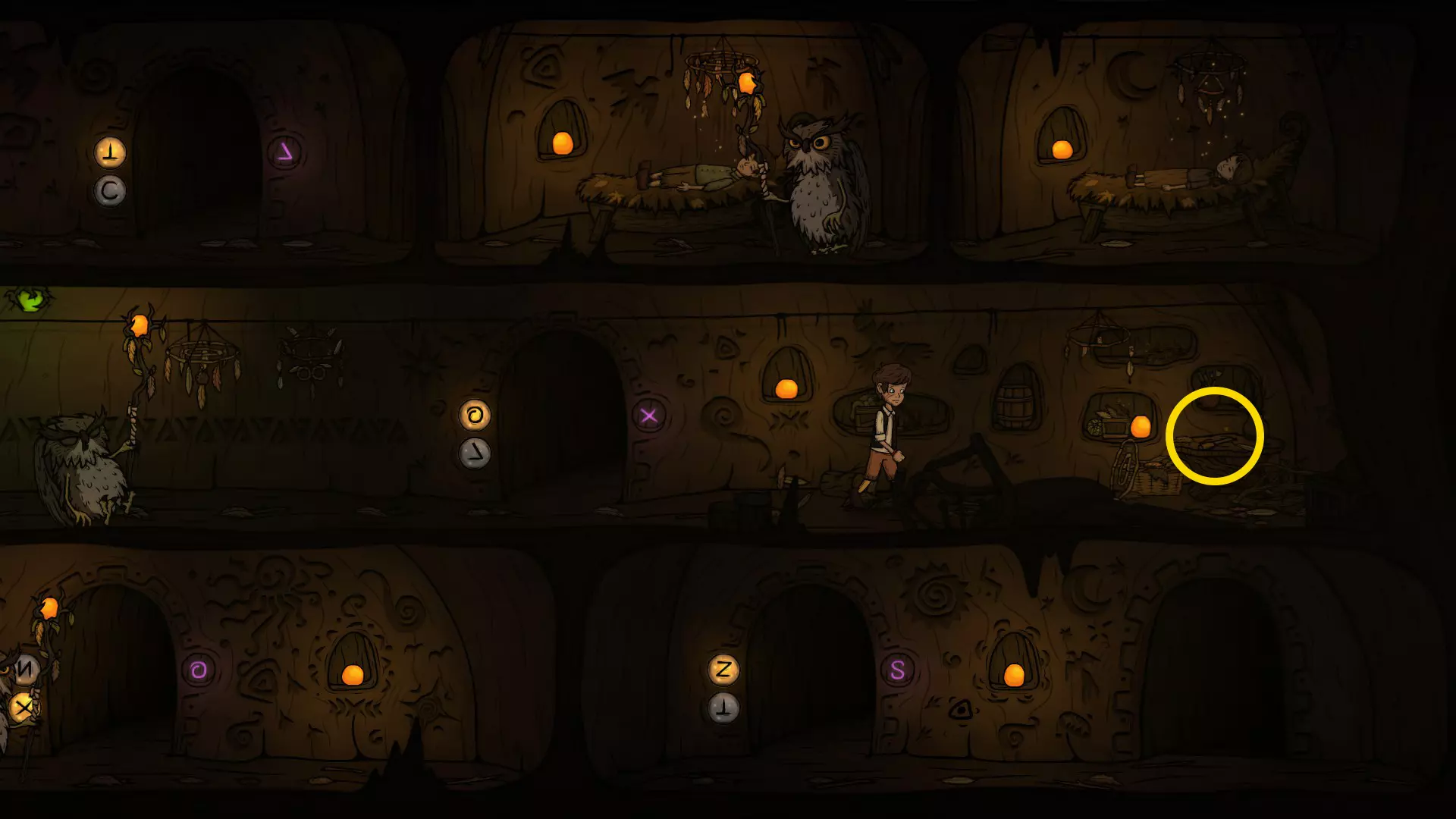 出门后先切换一下按钮,让O门的灯亮起来,再往右走准备拉动机关。在这里可以看到右下方O门的巡逻猫头鹰,最好在巡逻猫头鹰正要往左走的时候再拉机关,这样下去O门的时间刚好。