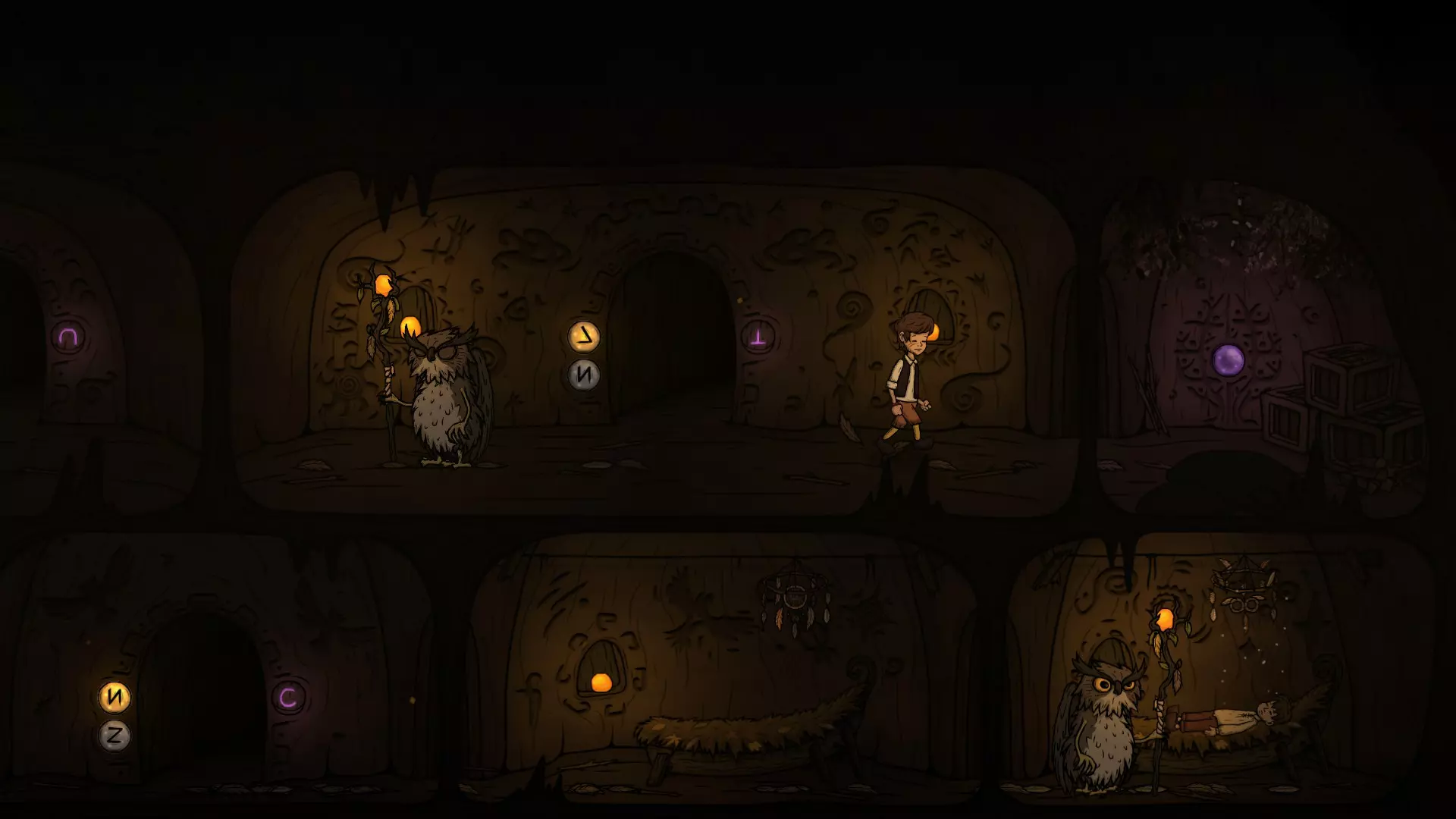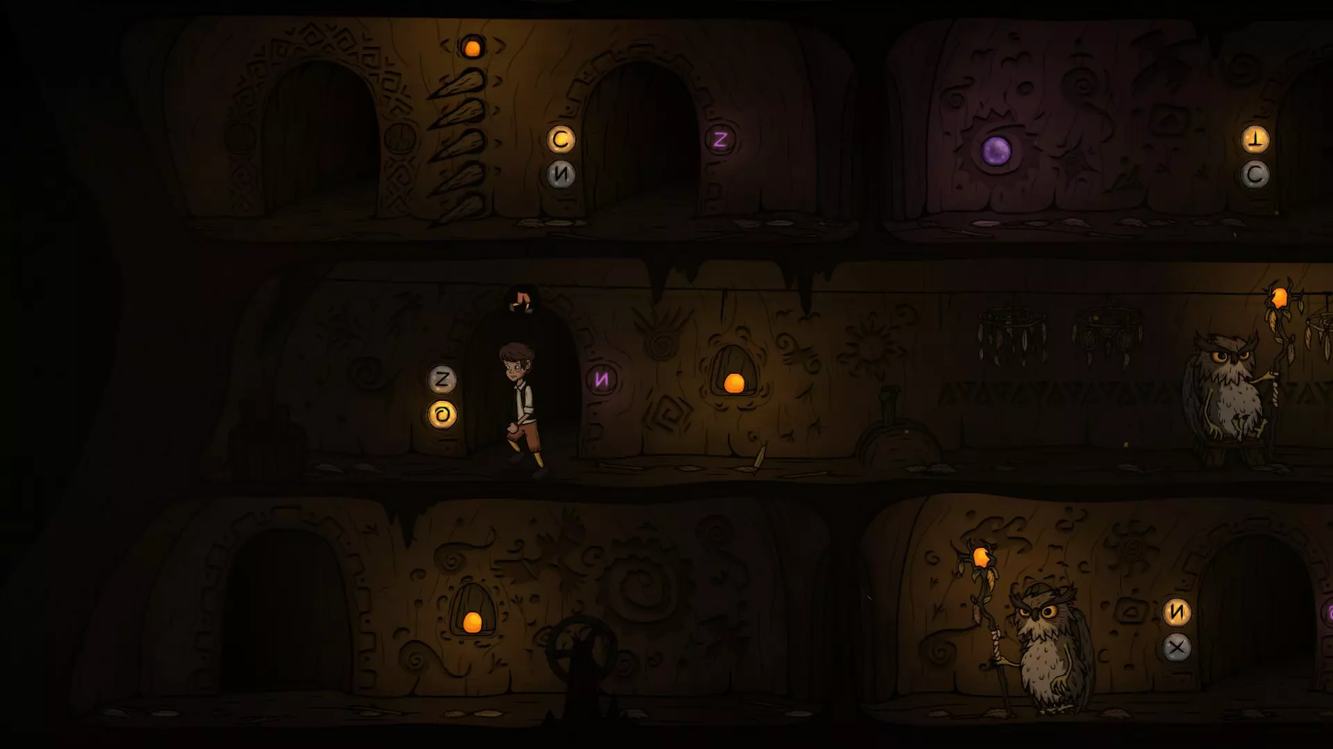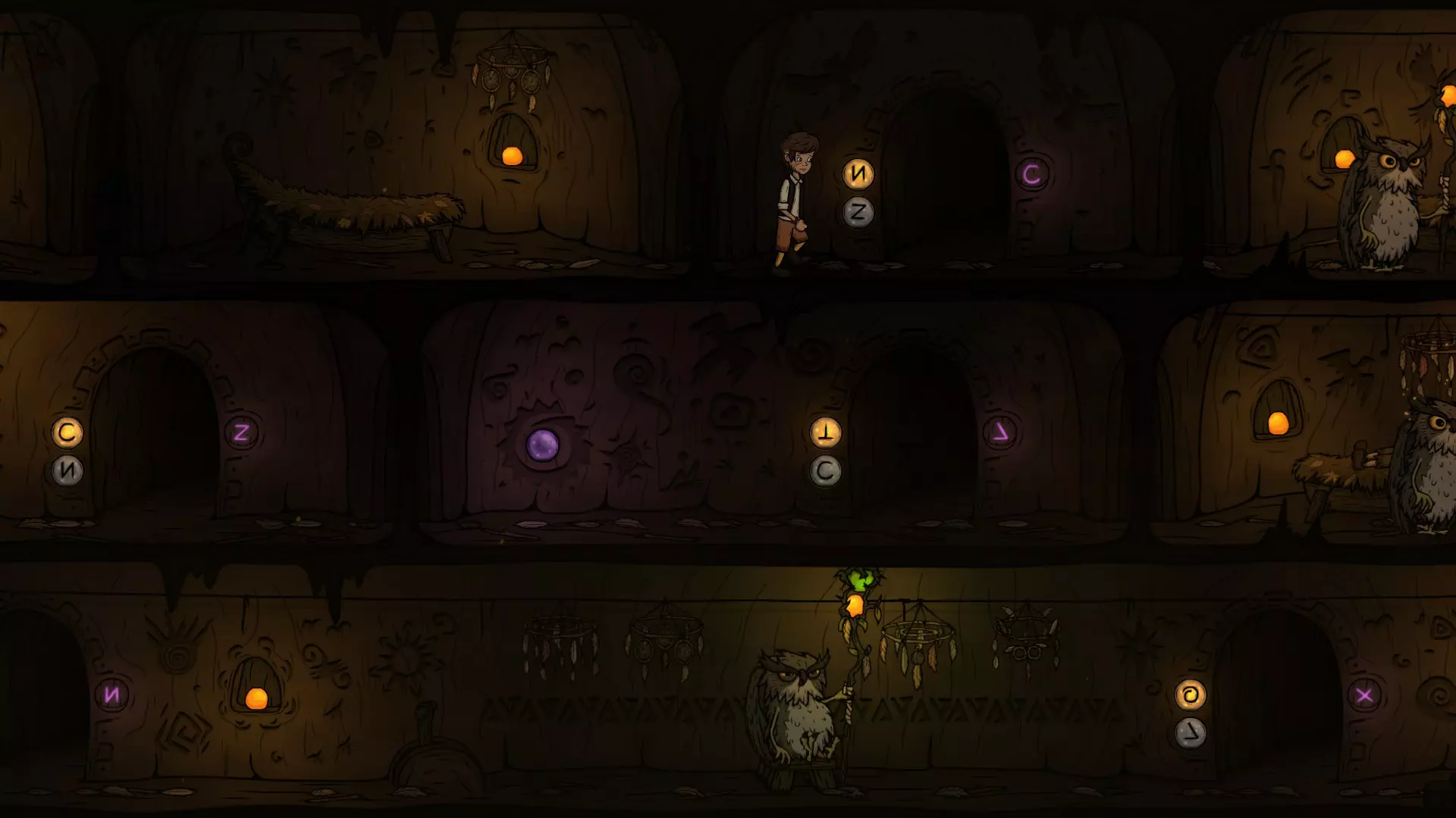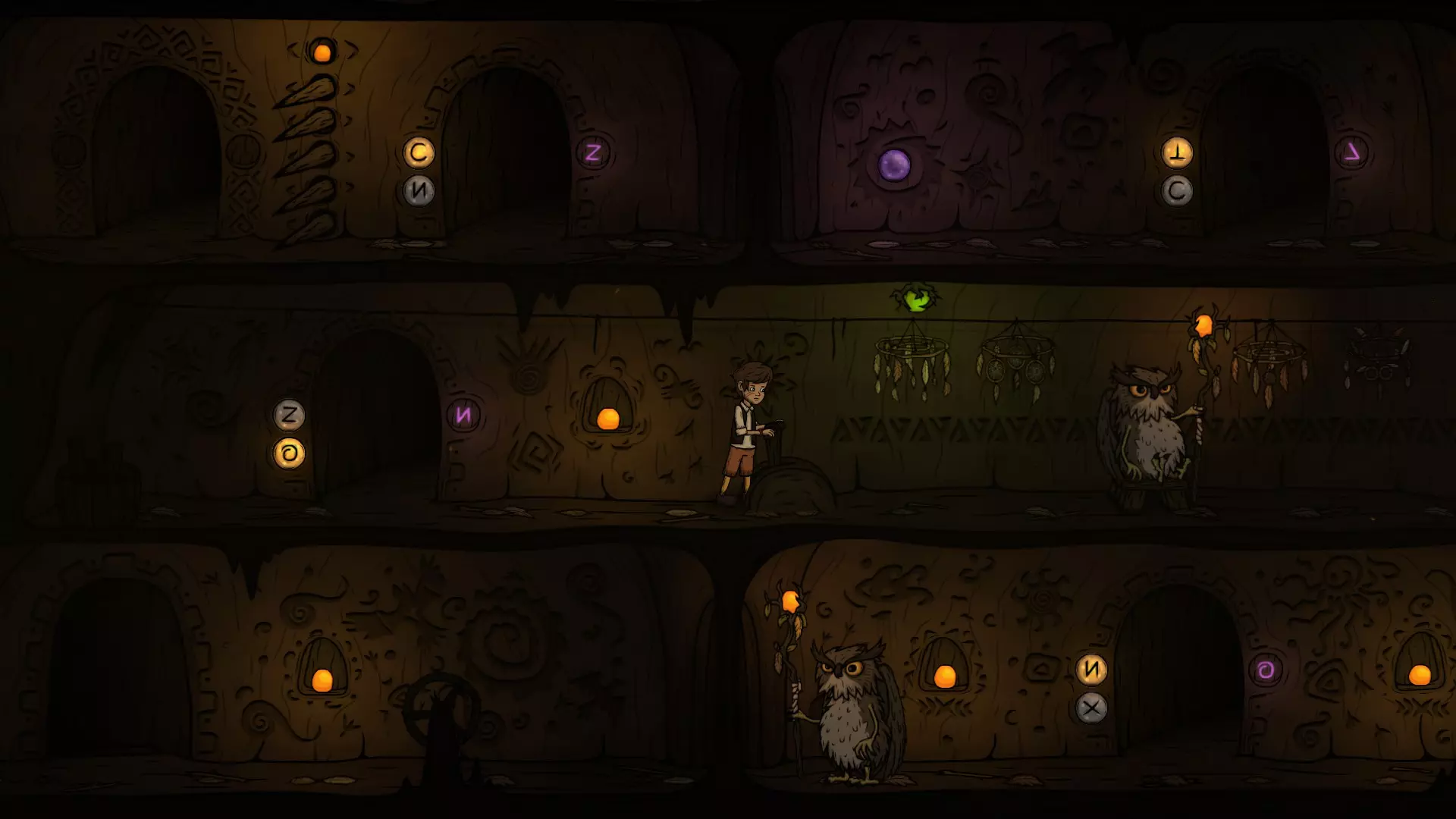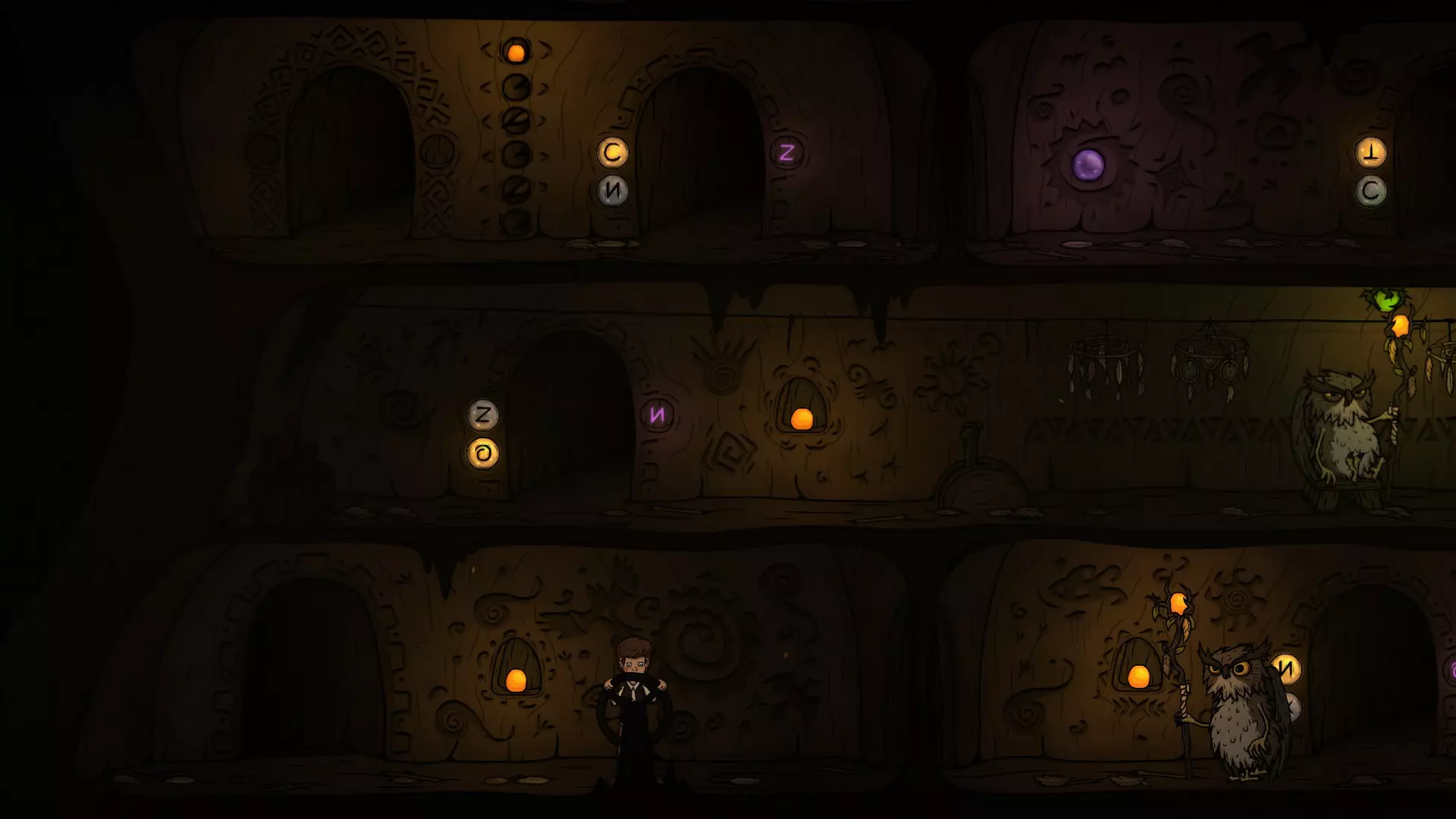 出门后先切换一下按钮,让O门的灯亮起来,再往右走准备拉动机关。在这里可以看到右下方O门的巡逻猫头鹰,最好在巡逻猫头鹰正要往左走的时候再拉机关,这样下去O门的时间刚好。