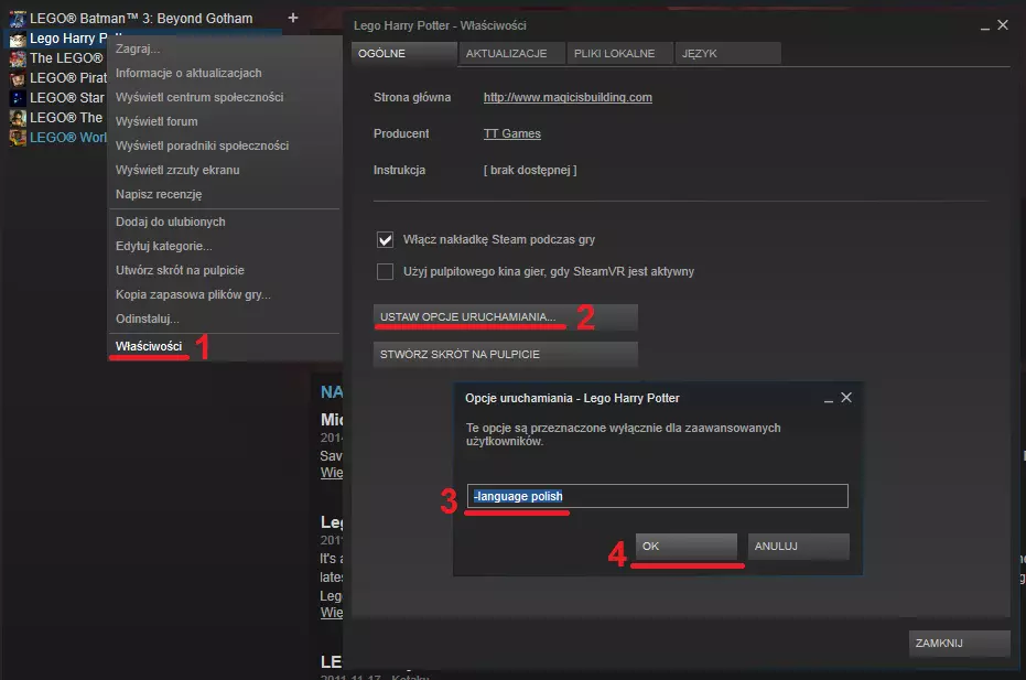 在本指南中,你将了解如何为《乐高哈利波特:1-4年》的Steam版和非Steam版进行波兰语本地化设置,无需下载任何文件! Steam版本地化设置 Steam版游戏的本地化设置非常简单! 只需在Steam库中右键点击游戏,选择属性,然后进入设置启动选项,并在其中输入以下命令:-language polish 完成!从现在开始,整个游戏将完全波兰语化!
