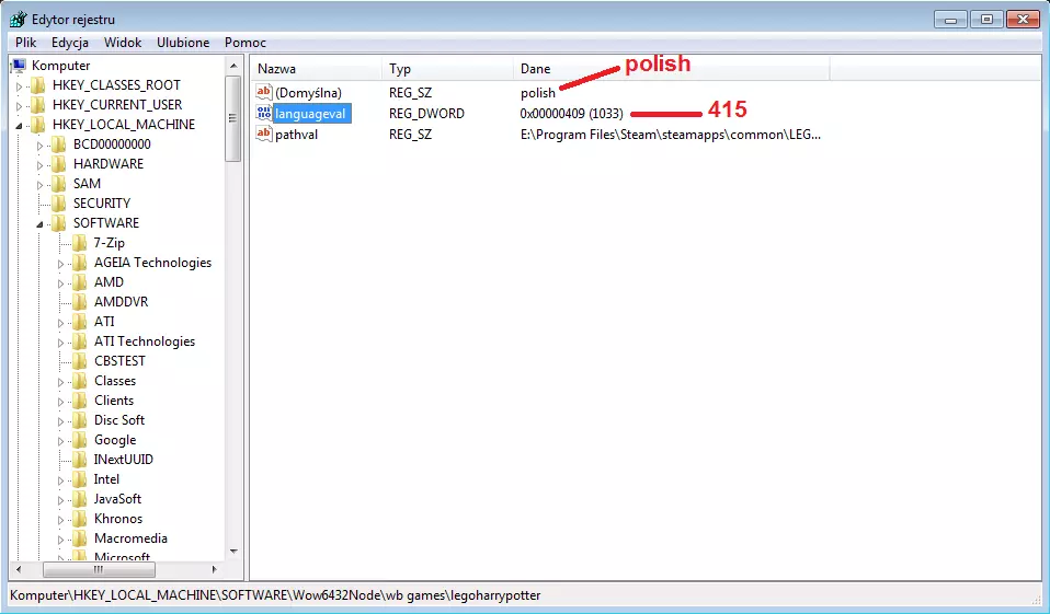 Steam外的波兰语化 通过Steam外的游戏波兰语化方法会多一些步骤,但依然非常简单! 1.首先打开注册表编辑器,在Windows搜索栏输入“regedit”(快捷键:Windows + R)。 2.现在需要找到“legoharrypotter”文件夹。 路径依次为:计算机 > HKEY_LOCAL_MACHINE > SOFTWARE > Wow6432Node > wb games > legoharrypotter 3.双击(默认)并输入“polish”。点击确定。 4.双击languageval,将409替换为415。点击确定。 完成!从此游戏就完全波兰语化了!