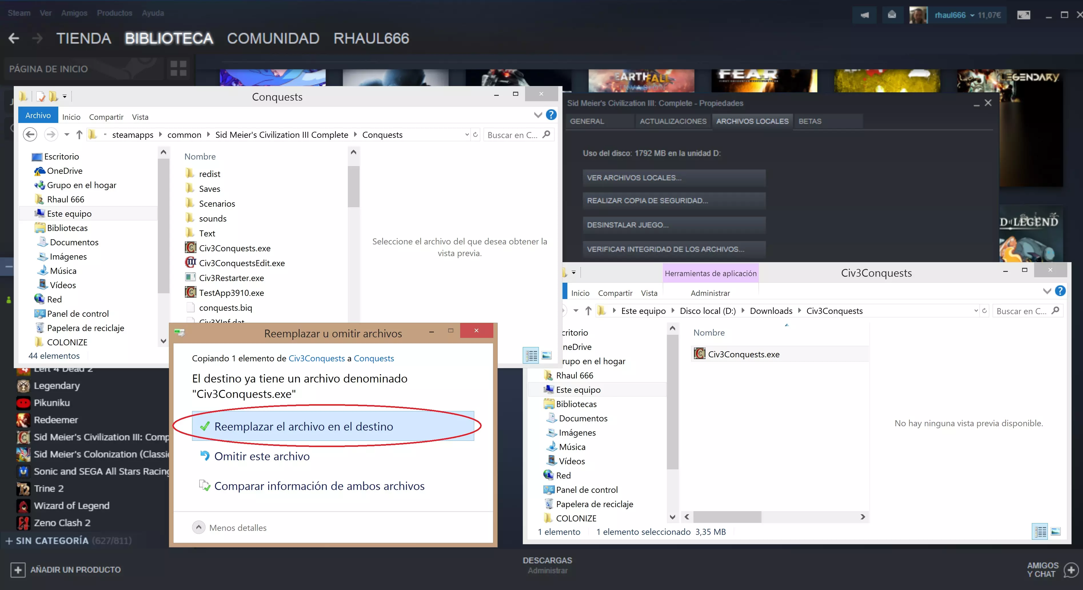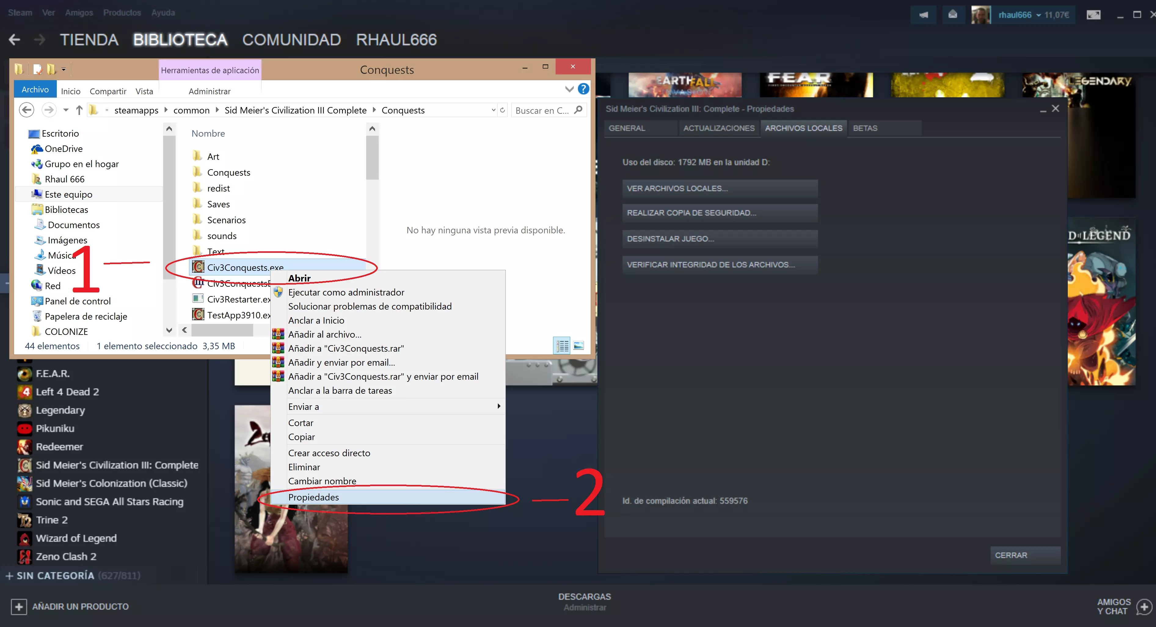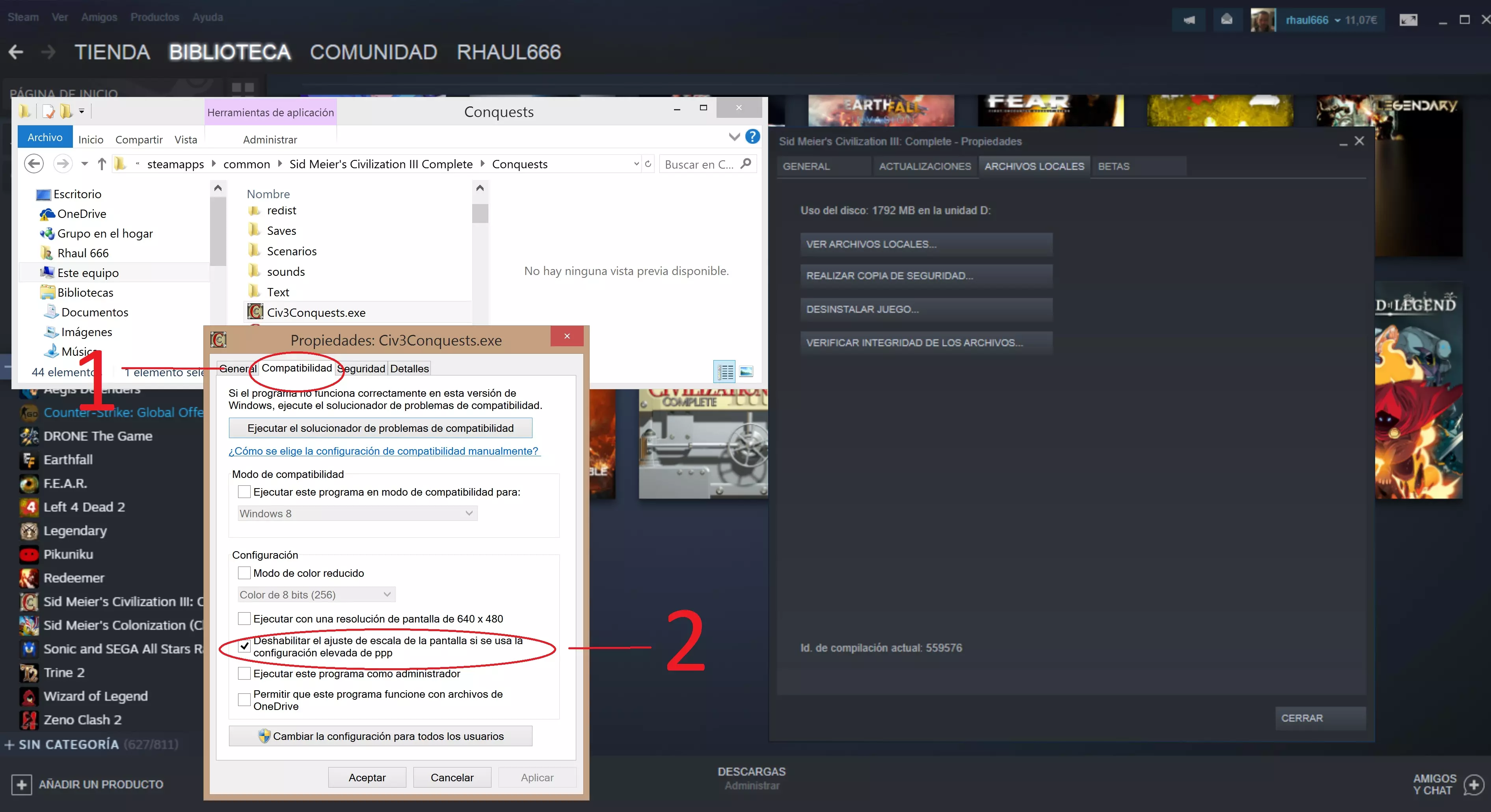 (点击任意图片可放大) 结束,现在我们可以正常游戏了 手动操作:我们也可以自行修改程序的可执行文件。按照前面的前三个步骤找到该文件,右键点击“civ3conquests.exe”文件的属性,并启用“高DPI设置时禁用缩放”选项卡。