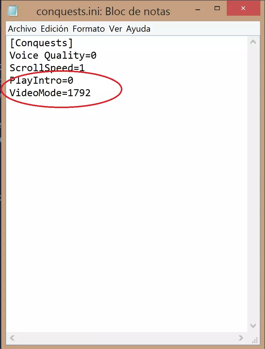 主要有3个有趣的命令可以添加,详情如下: VideoMode=1792 PlayIntro=0 KeepRes=1 注意:“1”表示启用,“0”表示禁用。 在此示例中,我已禁用游戏开场动画,并将程序的原生分辨率设置为1792x1344(1792)。 注意2:一旦使用所选默认选项配置游戏,此记事本中会自动添加更多命令。无需担心,这是正常现象,且不会与上述命令产生冲突。(点击图片可放大) 视频模式:此选项用于启用游戏原生的少数图形分辨率,具体如下: 1024、1024x768 1152、1152x864 1280、1280x1024 1600、1600x1200 1792、1792x1344 注意:此命令与“KeepRes”均用于设置分辨率,因此两者只需包含其中一个。 播放开场动画:该选项用于禁用游戏的开场动画视频(若将其改为1则会启用),因为有时开场动画可能会出现播放问题。 注意:如果希望启用开场动画,最好将此选项删除或直接不添加,默认情况下开场动画已启用,添加此选项并无必要。KeepRes:此选项启用后,游戏会被重新调整至桌面的分辨率,因此如果你的桌面分辨率是1080p或4k,游戏就会以相应的画质显示。不过需要强调的是,这种调整是通过拉伸图像来实现目标分辨率的,所以如果使用4k分辨率,画面尺寸会显得很小,但仍会以全屏模式显示,而非窗口模式或“方框”模式。 注意:使用此命令后,菜单可能会以小窗口的形式显示。不必担心,一旦开始游戏,画面就会完整显示。