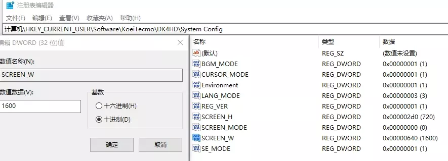 《大航海时代4 威力加强版 HD》窗口分辨率修改方法 第一、键盘按下【win键】+【R键】,在左下角框中输入【regedit】,确定或回车,进入注册表 第二、点击【HKEY_CURRENT_USER】->【SOFTWARE】->【KoeiTecmo】->【DK4HD】->【System Config】 第三、修改【System Config】里的【SCREEN_W】【SCREEN_H】数值 【SCREEN_W】=宽 (例如:1920或1600或1440) 【SCREEN_H】=高 (例如:1000或900或810) 第四、不会算十六位的朋友们,建议点十进位后再修改数值不容易出错,比如把宽的数值从1280改成1600