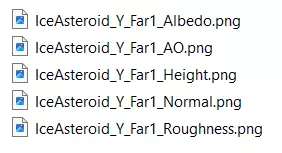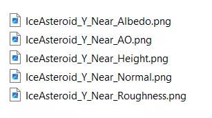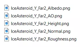 Far2 波兰语:下载纹理集后,使用图像编辑程序修改每个集的反照率文件,使其更像冰。 导出:将文件导出为.png格式,并确保其余文件具有相同的文件格式(编辑器不允许混合使用不同格式创建材质) 命名:命名格式为<名称_<轴>_<距离>_<类型>,例如IceAsteroid_Y_Near_Albedo。对所有文件执行此操作(注意距离的用途)