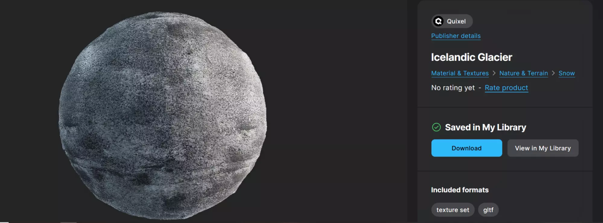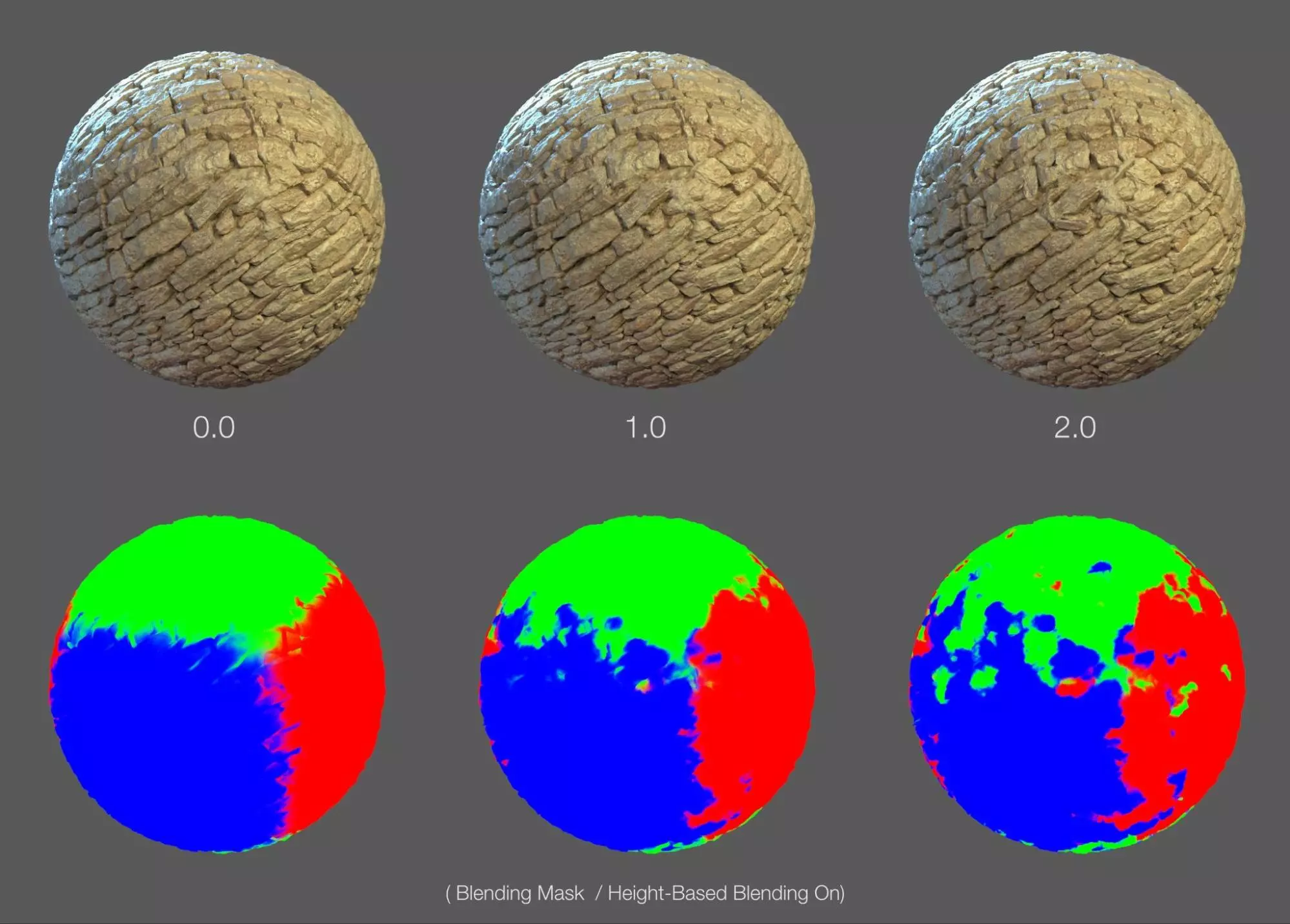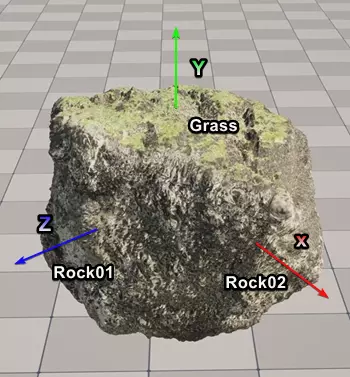 根据角色与该体素的距离,其纹理集将从一种过渡到另一种。 美术流程示例 在此示例中,单个纹理均匀应用于所有轴,为简化和保持一致性,距离是唯一的变化来源。尽管可以为顶部、正面和侧面实现单独的纹理,但此处未包含该内容。 源纹理:要基于距离(近、远1和远2)创建体素材质的变体,请找到或创建三种不同的材质。例如,冰小行星是使用三种源自“megascans”的不同材质创建的。