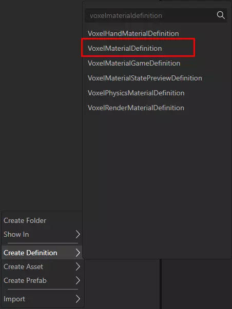 创建体素材质定义 体素材质定义 创建体素材质:在项目资源管理器的空白处右键点击,选择创建定义→搜索并选择体素材质定义