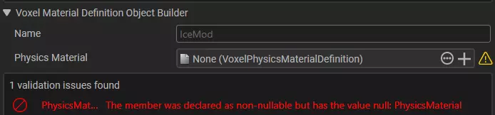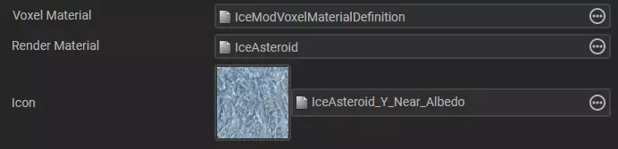 名称定义:将你的定义命名为“IceModVoxelMaterialDefinition” 命名材质:新创建的定义应自动被选中并在【属性检查器】中处于焦点状态,在名称字段中为该材质命名,例如“IceMod” 物理材质:左键点击物理材质字段中显示“None (VoxelPhysicsMaterialDefinition)”处的资源查找器按钮(...),搜索并选择“IceLikeMaterial.def”