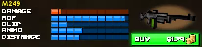 名称 爆头 胸射 臂射 腿射 弹夹容量 M249 50 25 22 12 100 支援 M3