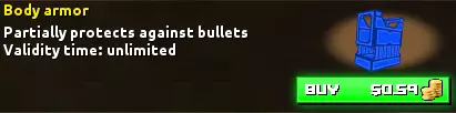 在被摧毁前完全抵消对胸部造成的伤害。 可承受总计40点伤害、1发子弹或2次近战攻击(具体数值在30-40之间) 例1:MP5的3发子弹可将其破坏。前两发子弹15+15=30,加上第三发子弹达到45,此时护甲破坏。 例2:AK47的2发子弹可将其破坏,第一发20点伤害,第二发再造成20点伤害,总计40点,此时护甲破坏。 例3:M14的1发子弹即可破坏护甲,因其造成50点伤害。 在上述所有情况下,均不会对生命值造成伤害。 防弹衣可抵挡1次火箭筒攻击或手榴弹伤害,但TNT会无视护甲。最后要对那些说这款游戏是付费取胜的人说一句:付费确实能带来优势,但没有什么是技术无法克服的。