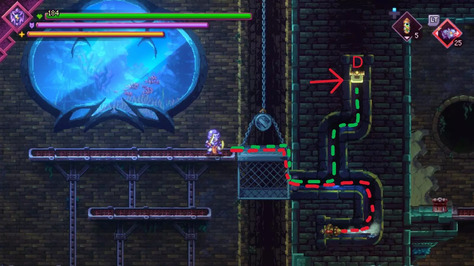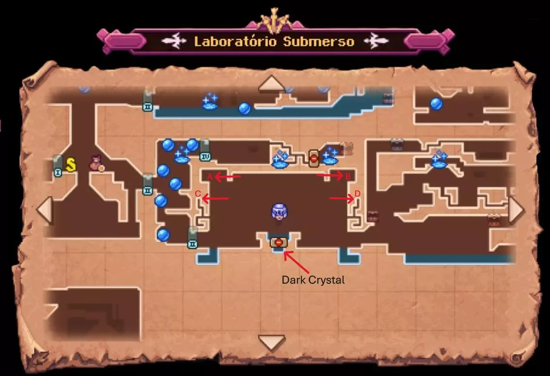 这个bug发生在我们去水下实验室解决谜题时,那里有四个开关需要在房间内激活,其中两个开关(图中的C和D开关)我们需要使用猪炸弹来打开通往水晶的通道,但该bug会导致猪炸弹无法到达开关,而是被引导到错误的方向。