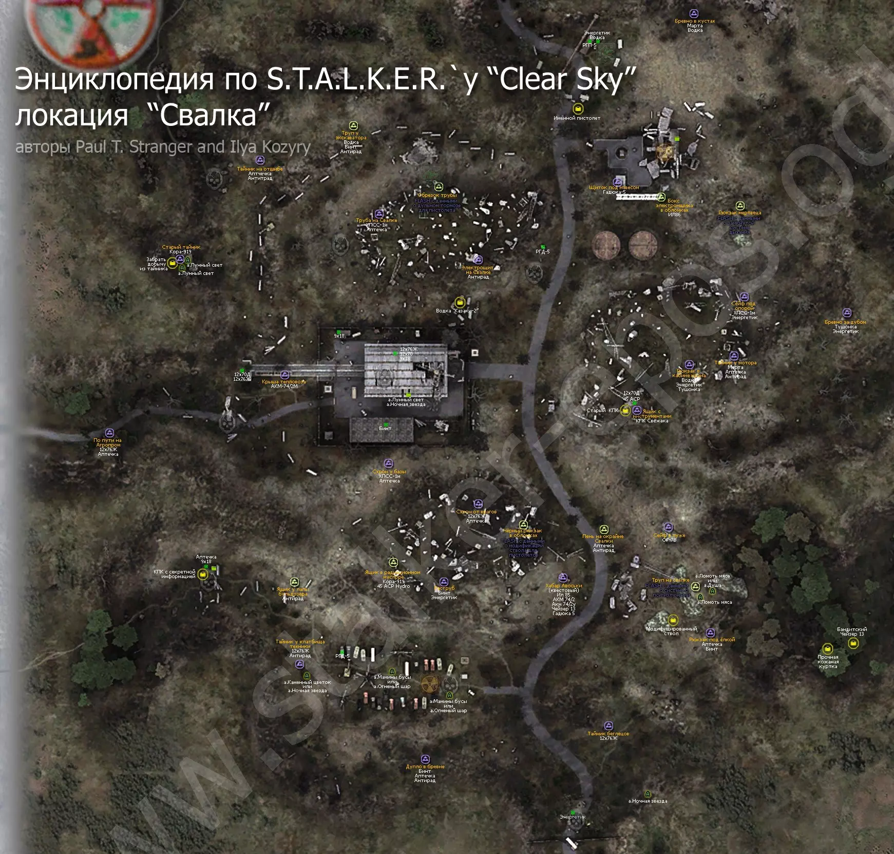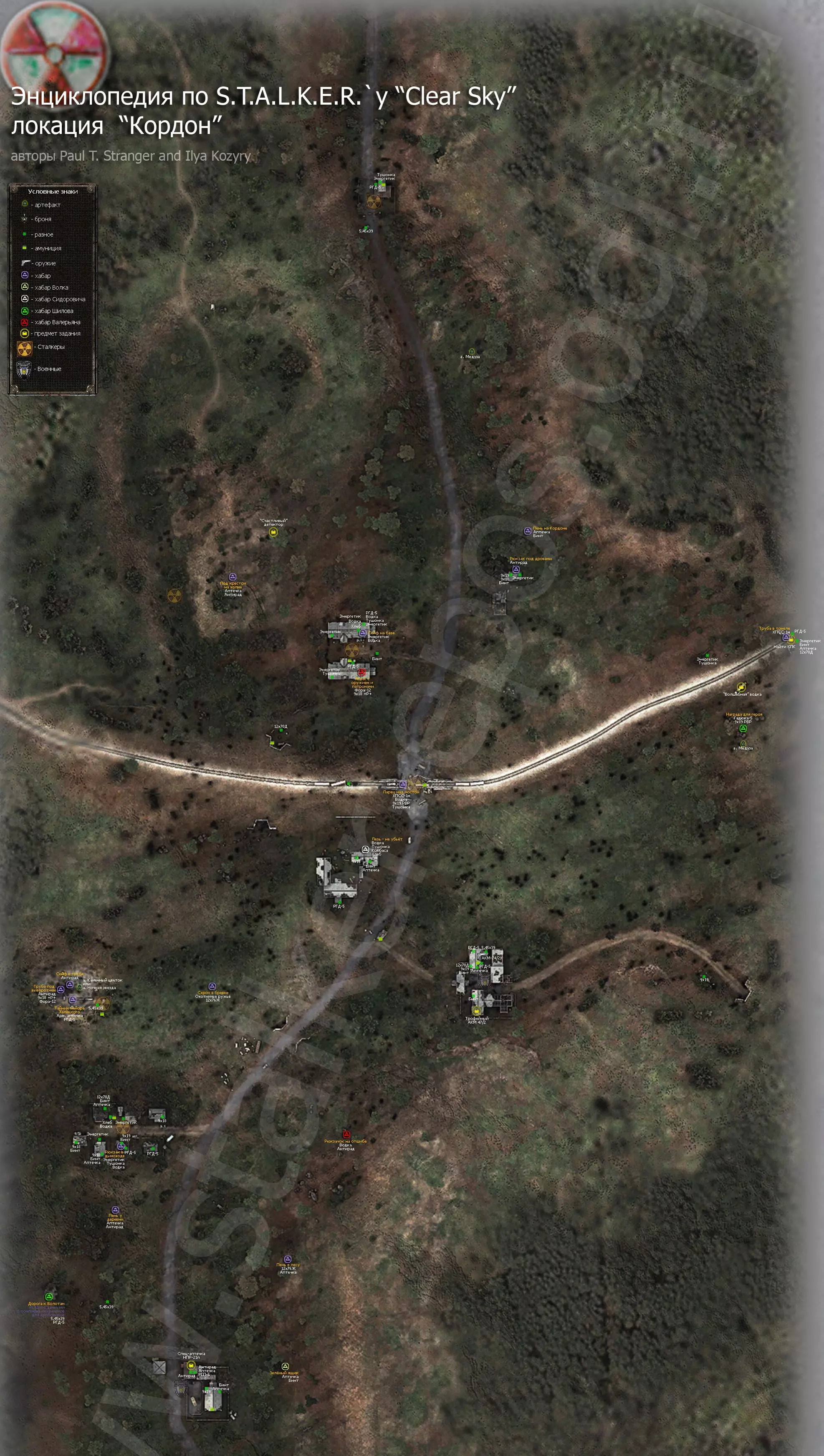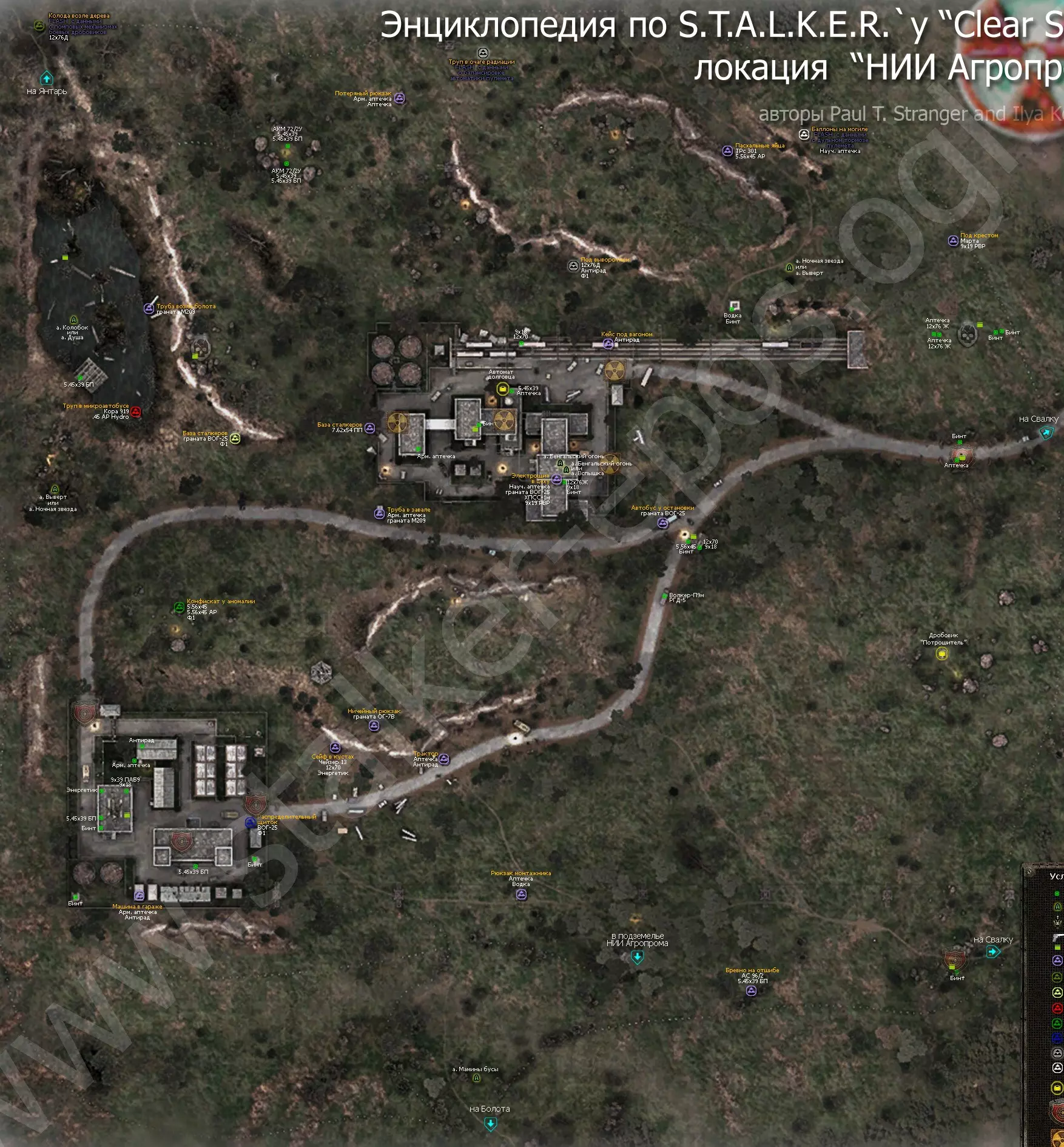 《潜行者:晴空》所有地点的详细地图。地图上标记了隐藏点、关键物品和人物、避难所、 artifacts(神器)、聚集区。沼泽