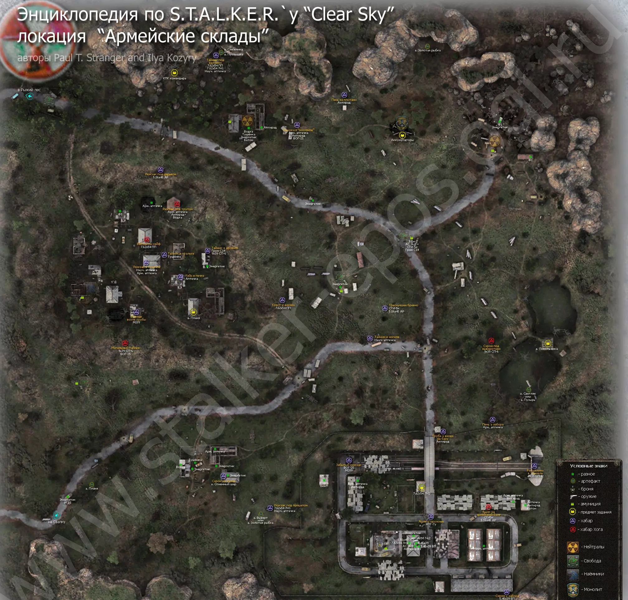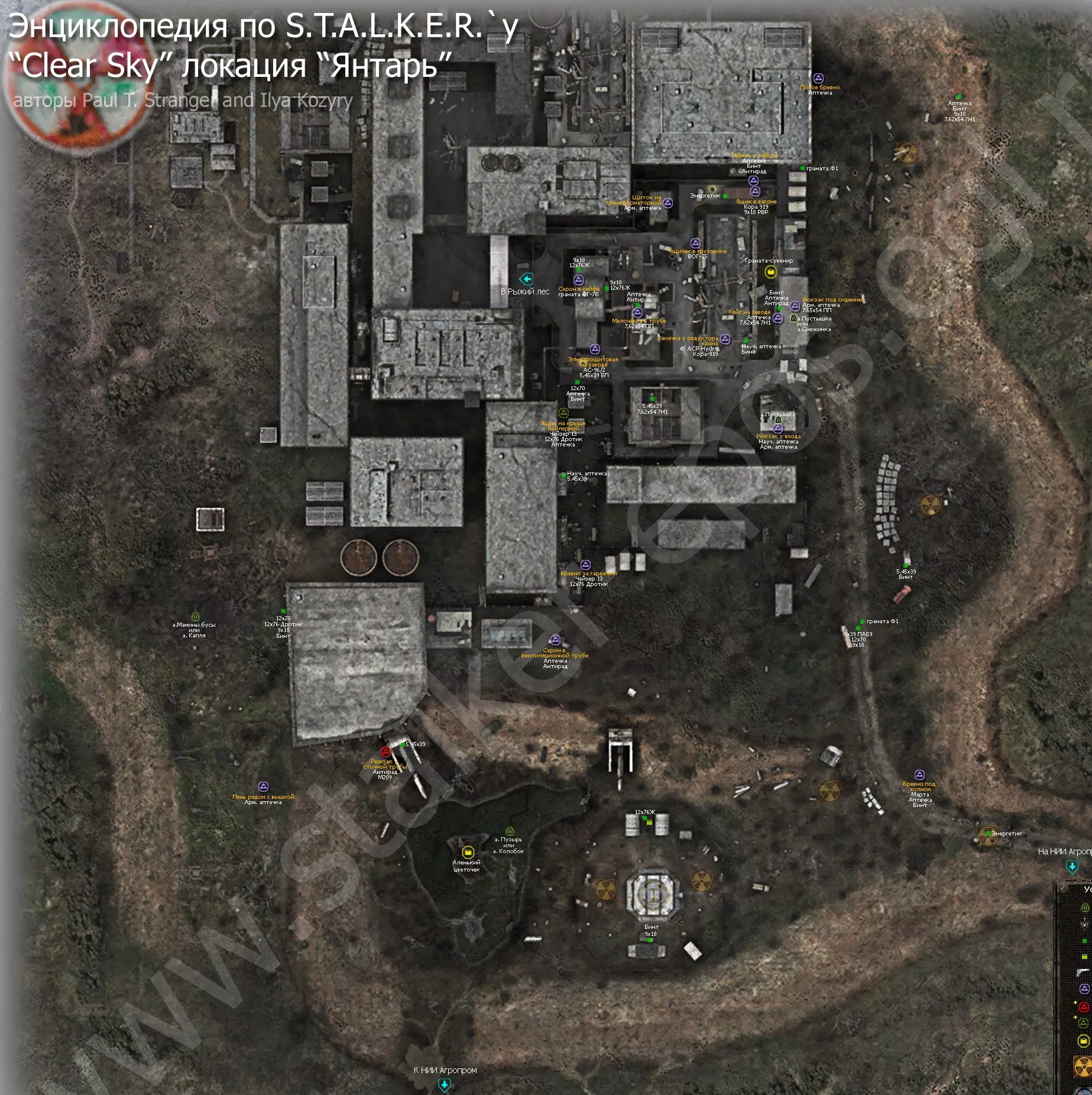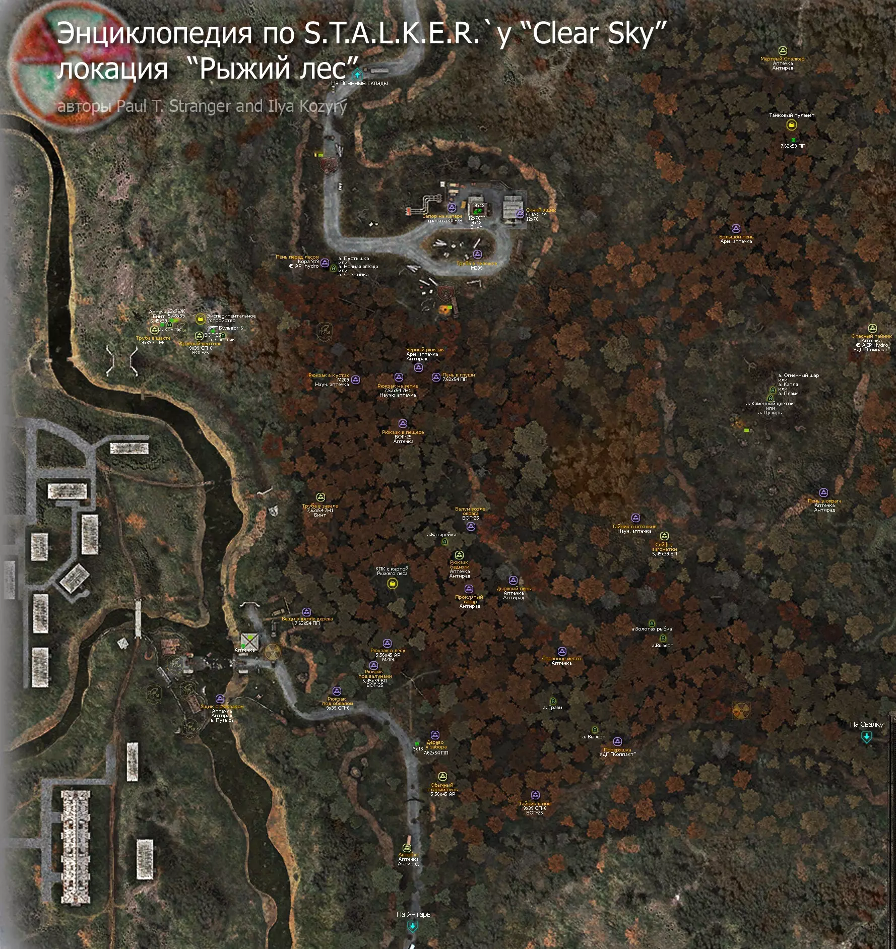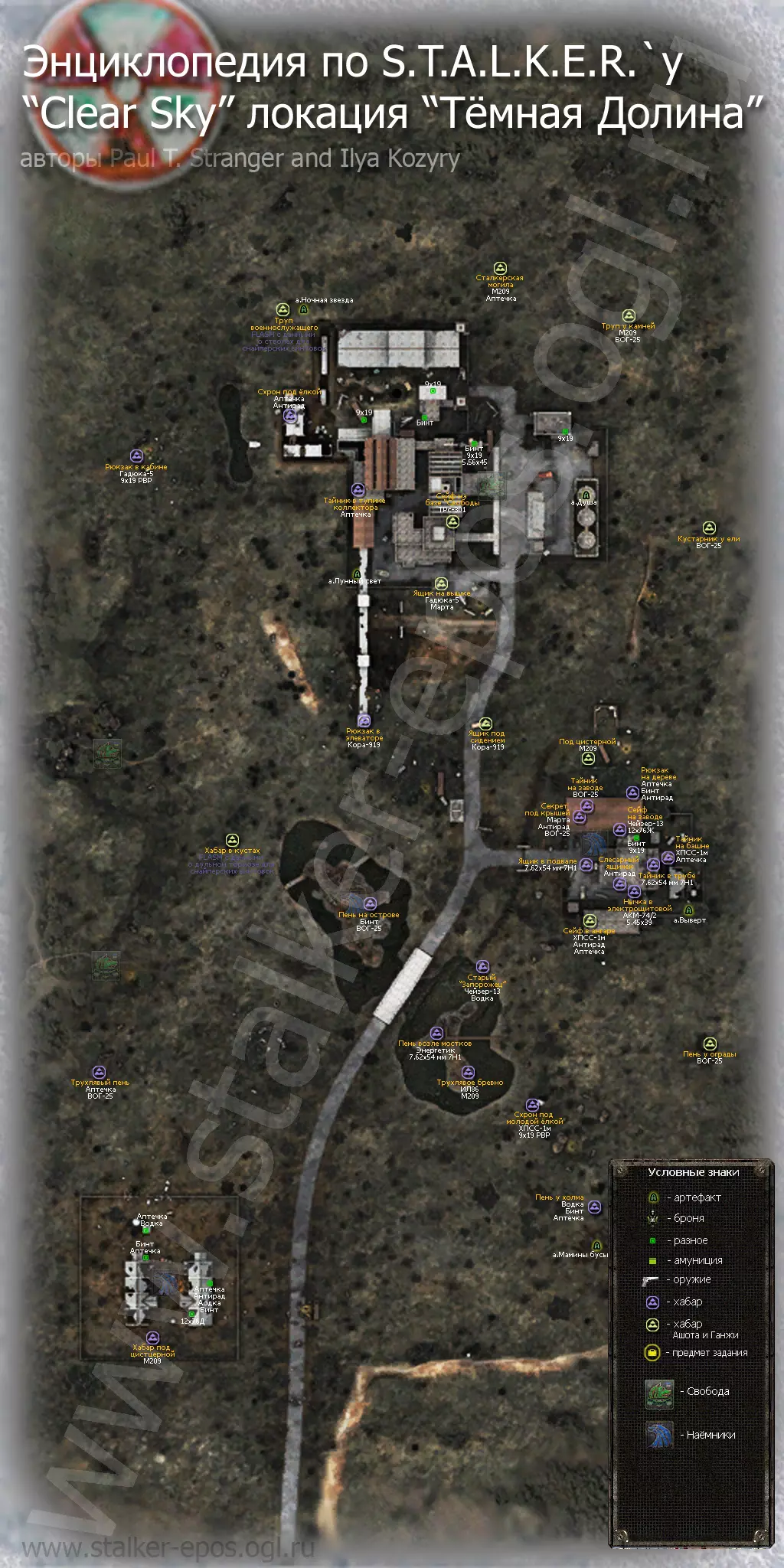 《潜行者:晴空》所有地点的详细地图。地图上标记了隐藏点、关键物品和人物、避难所、 artifacts(神器)、聚集区。沼泽