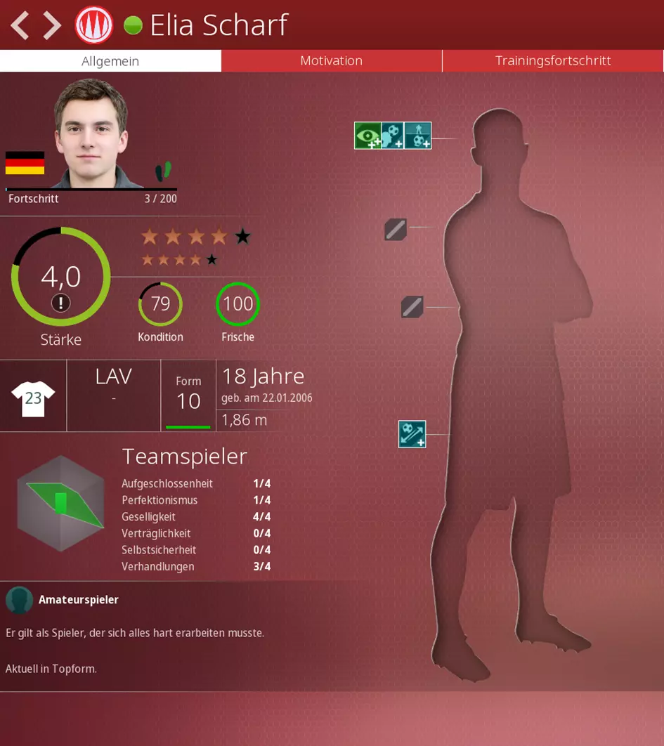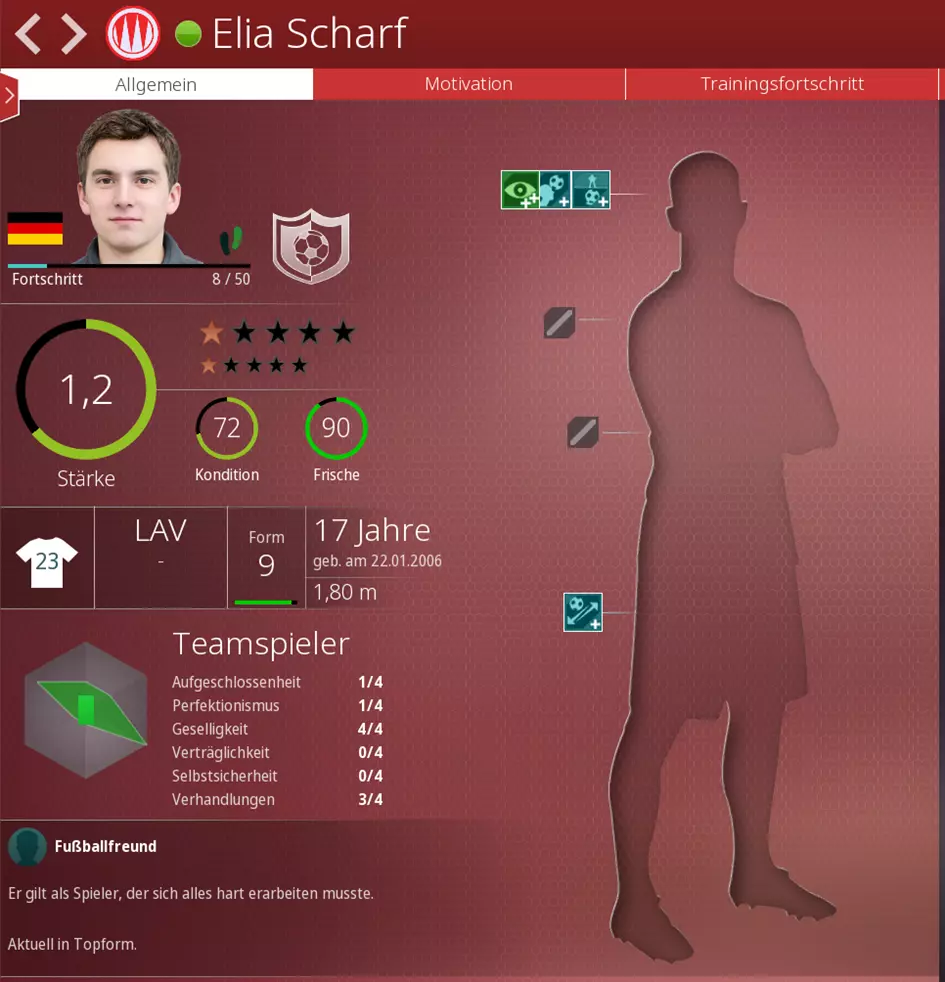 一名没有天赋的球员在地区联赛中如果一直获得出场机会,会如何发展? 赛季初 一名来自维尔茨堡青训营的球员,拥有4项积极技能。 该球员被提拔上来,能力值为1.2: