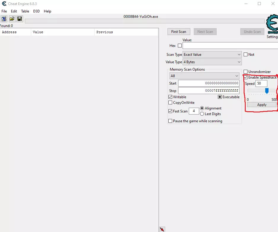 然后处理右侧的设置。勾选“启用速度修改”,然后将速度设置为你喜欢的数值。我喜欢快速进行游戏,所以选择50。然后点击应用,搞定!你现在就像患有多动症的孩子一样在玩一款儿童卡牌游戏。恭喜你。