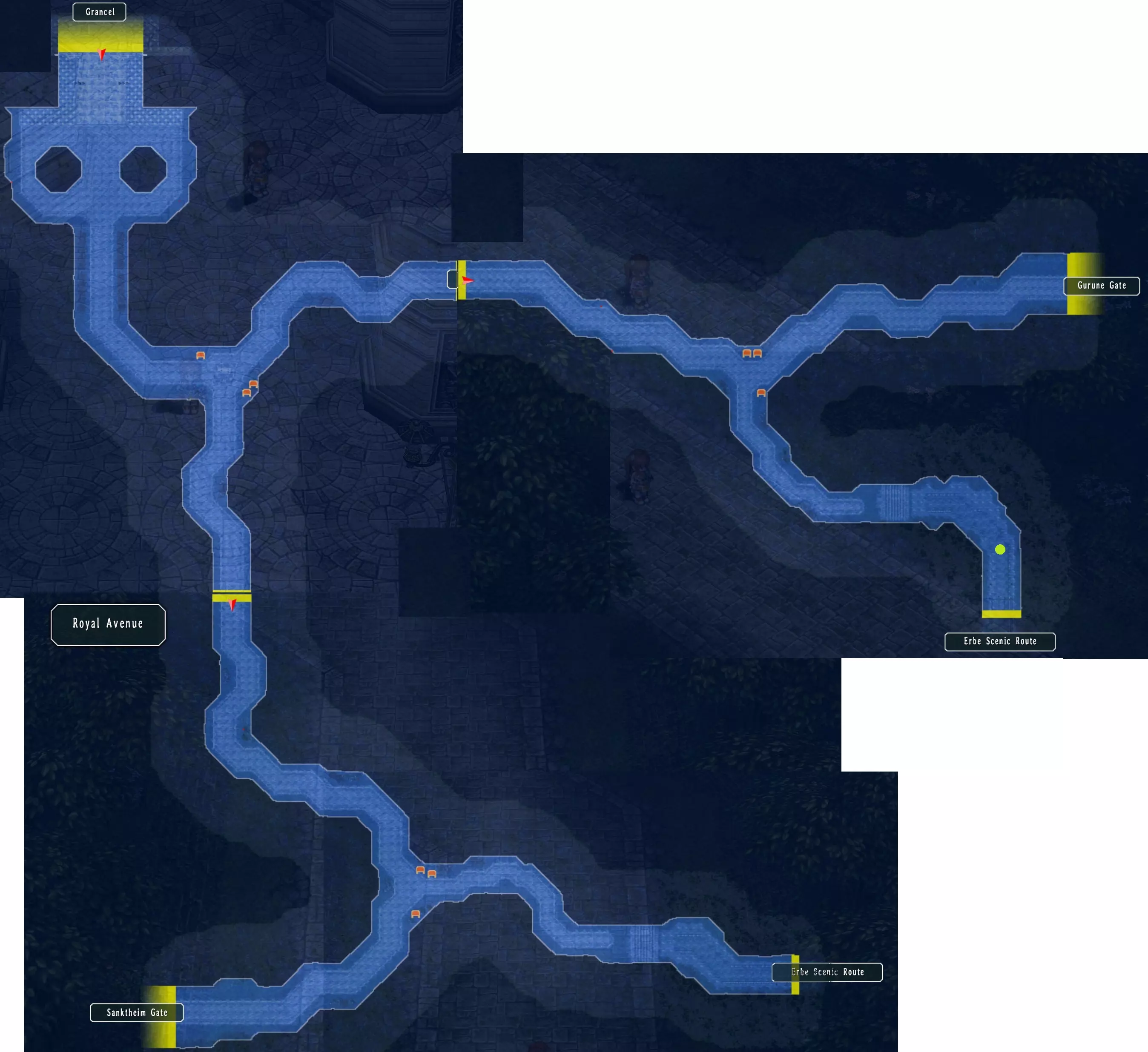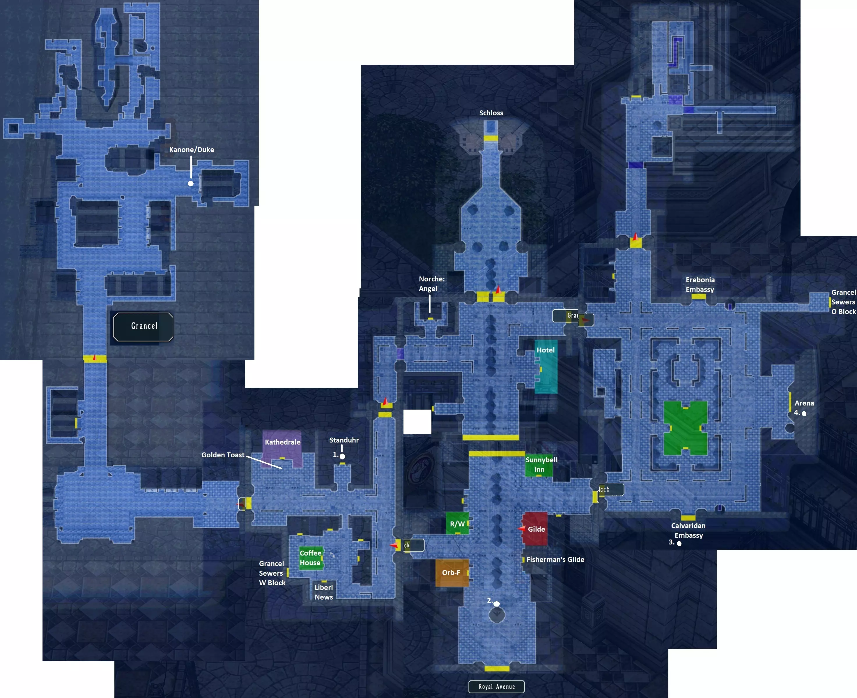 此地点可钓鱼 珍珠玻璃(别墅)(22/26):螃蟹、食石鱼、鳗鱼、山荷鱼、鲦鱼、利贝尔鲤鱼、鲤鱼、虹鳟鱼、虎石斑鱼 格兰赛尔 公告板新增两个任务:埃尔贝景观路的怪物、格兰赛尔下水道的怪物 右下角摊位:甜蜜可丽饼、神秘可丽饼,摊位物品:活力爆米花 导力工房:精神3、冻结、护盾2和3、回避2和3、行动3、移动2、攻击 阳光铃旅馆:海鲜火锅、嘲讽派 咖啡屋:梦幻咖喱、醒神咖啡 与大教堂前的鸽子金吐司对话 在北街区最上方的房子里,从诺尔雪处获得翠竹钓竿 东街区冰淇淋摊:究极冰淇淋、阳光冰淇淋、月光冰淇淋(36/68) 与市场前的安东对话。市场内:利贝尔新闻4前往西街区的下水道。