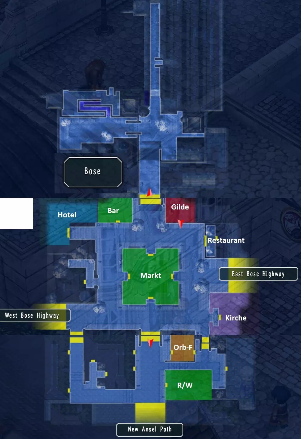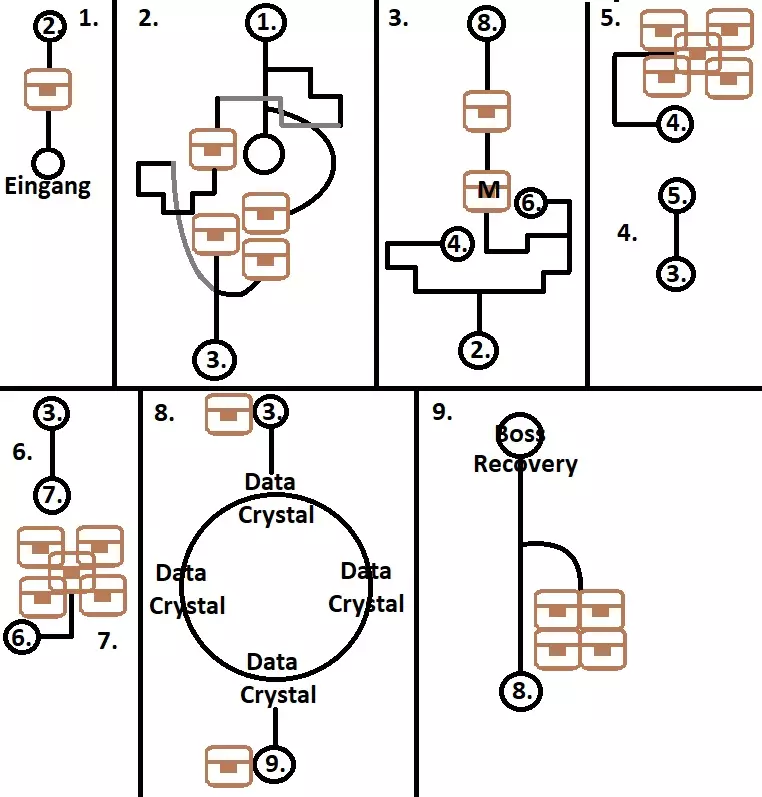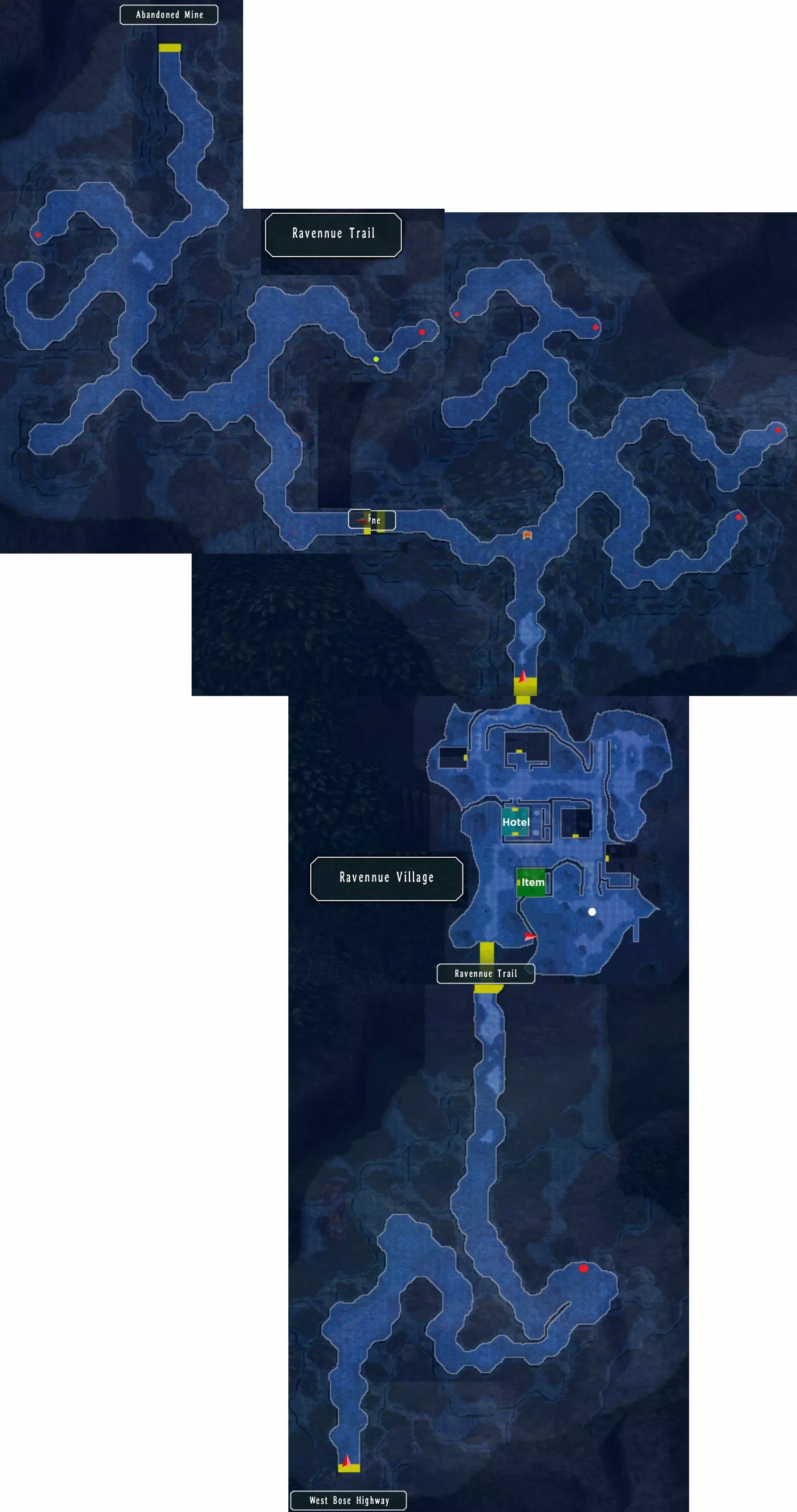 废弃矿山 这里有六个宝箱:EP填充剂II、EP填充剂、鱼子、治愈药膏、百胜牛排、赤眼石(242/517) 水边右侧有一个宝箱,左侧可继续前进。 左侧有一个宝箱,向上继续走,左侧还有两个宝箱。 上方有另一个宝箱,右侧通往巨龙处。之后返回村庄。(56/68) 返回玻色前,先再次前往上方左侧的屋子。 第五章 - 第二部分 玻色及其他 在酒店二楼左侧房间可获得利贝尔时事特刊。 准备好后前往飞机场,等待空艇。 与空艇上的人交谈,直至最终与巨龙交战。 前往甲板,可看到水中的巨龙。公告板上的新任务:拉文努山道的怪物 你可以在矿场前最后一张地图的右侧死胡同里找到目标怪物。 拉文努山道的怪物,奖励:6500米拉,5BP(243/382) 接下来通过东柏斯街道前往迷雾峡谷,向右走并在威尔默的小屋里与他对话。 回到入口后向左走,前往之前目标怪物所在的位置,那里现在有一座桥。一直走到尽头。 古龙的住所 这里有11个宝箱:破甲装置、EP填充剂、中回复药、乌木长靴、EP填充剂、苍天之剑、彩虹惊喜、地之耀晶片×100、复活药、全回复药、迷雾面纱(253/517) 沿着道路前进,左上方有两个宝箱,继续向左下方走。第一章第一个通道有两个宝箱,第二个通道继续前进,上方有两个宝箱,向左走继续前进。 上方还有一个宝箱,向下继续前进。 沿着这条路走,上方水中有一个宝箱,向下继续前进。 先穿过第二个通道,这里有三个宝箱。 在第一个通道你终于找到了龙。成就:That Which One Must Protect 第六章 下到甲板并进入舰桥。波塞 龙袭事件,奖励:2000米拉,3+3 BP(249/382) 追缉巨龙,奖励:8000米拉,7 BP(256/382) 等级奖励:圣杯挂坠 布告栏新增两个任务:遥远岁月的回忆、商人护卫 现在你需要前往金鱼旅馆变更队伍,但先不要开始聚会。 在酒吧和科尔娜对话。前往市长家二楼,先给莉拉看照片,再给市长夫人看。【往昔的回忆】,奖励:3500米拉,5BP(261/382) 在利贝尔通讯社8号店可获得相关物品。 前往瓦雷利亚海岸,与码头上右侧的桑野对话,然后前往导力工房前的第二间屋子找塞西莉,她会给你【湖主2号天使】。 前往导力工房前的第一间屋子找米拉诺。之后她会在通往西柏斯 highway的出口处等你。 护送这位女士前往拉文努村,途中不进入战斗可额外获得+2BP。【商人护卫】,奖励:5000+5000米拉,3+2BP(266/382) 拉文努村与废弃矿山 在道具店前从莱维处获得【赌徒杰克8】。 前往矿山接受另一个任务并获取那里的最后一个宝箱。与皇家军队军官对话,协助他清除矿场中的怪物。右侧有一只怪物,左侧死胡同里有一只,左上方桥梁后方还有一只。 现在前往外部。下方通道有这里的最后一个宝箱。上方有两条通道,每条通道后各有一只怪物。当你击败所有怪物后会得到提示。 矿场清除任务,奖励:8000米拉,6 BP(272/382) 哈肯 Gate 与迷雾峡谷 通过东柏斯 highway 和钢铁大道前往哈肯 Gate。在这里从卡洛斯处获得【赌徒杰克9】。 接着前往迷雾峡谷的小屋获取黑暗炖菜。(57/68) 完成所有事情后前往瓦雷利亚海岸和金鱼旅店休息。 前往湖边右侧的栈桥,会发现库尔特不省人事。出发前请更换装备并组建队伍,之后将无法再进行调整。 实验室 这里有十九个宝箱:蜂鸣器、绞盘(M)、EP填充II、防御4、EP填充、夜视镜、治愈药膏、乌木鞋、星兔、迷雾面纱、午睡曲奇、攻击4(M)、乌木套装、强效治愈药膏、治愈药膏、时、空、幻耀耀晶片×50、风耀晶片×200、火耀晶片×200、地耀晶片×200(272/517) 从左侧的门进入,另一扇门仍处于关闭状态。你们会遭遇战斗。 上方的门需要蓝色卡片,左下方有宝箱,向右前进至带有开关的房间。 扳动开关后,你将回到室外,这里正是之前关闭的那扇门。 继续向右有一个会遭遇怪物的宝箱,向上前进,两次向右转后各有一个宝箱。此前关闭的门需要绿色和红色卡片。 上方电梯需要红色卡片,左侧有充能点和战斗:格兰特。击败他后,从他身后的机器中获得红色钥匙卡。 红色封闭门后,只有一个用于过场动画的机器人,另一个是向上的电梯。 下一层左侧有蓝色门,右侧是绿色电梯。 向右下方有一个宝箱,再向右还有一个宝箱,左侧是绿色门。 继续向右下方有宝箱,向左前进。 左侧是绿色门,继续向上会变暗,左侧是蓝色门,右侧有宝箱,上方是 boss 战:卡娜。击败她后,从她身后的机器中获得绿色钥匙卡。 之前的绿色门后有一个宝箱,另一扇门后只有一个机器人。 一层的门后有一个宝箱。乘坐绿色电梯上楼,下楼出去有一个宝箱,左边是蓝色电梯,继续前进。(58/68) 左侧通道有蓝色门,右侧是有怪物的宝箱。 这个房间下方有三个宝箱,左侧是另一场 boss 战:安洁莉卡。之后在机器处获得蓝色卡钥,用于打开最后的锁着的门。 所有楼层蓝色门后面的宝箱都没有怪物。 乘坐蓝色电梯,在顶层 boss 战之前:三个假约书亚,一个回复点。 前往屋顶,观看艾丝蒂尔被掳走的剧情。