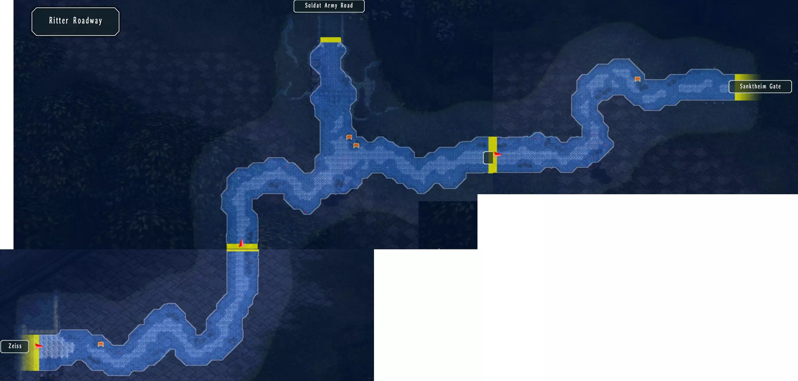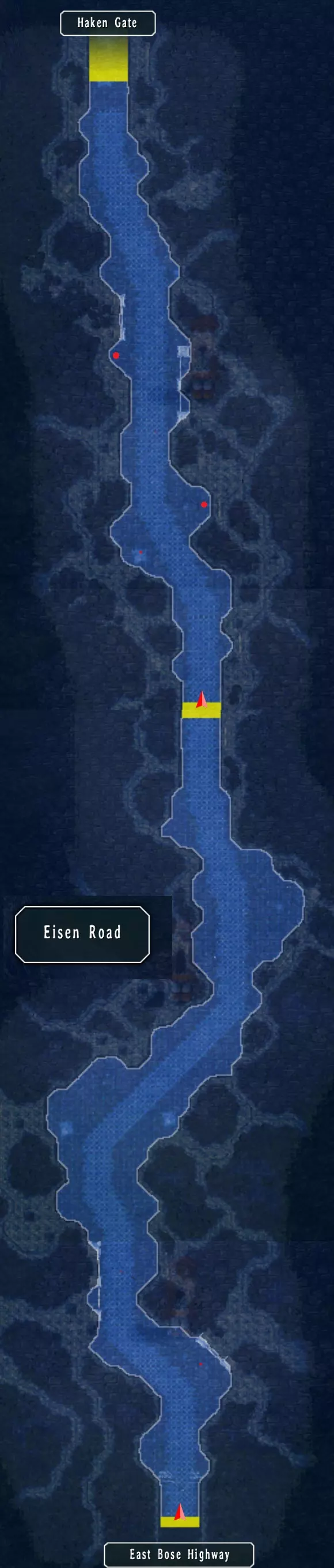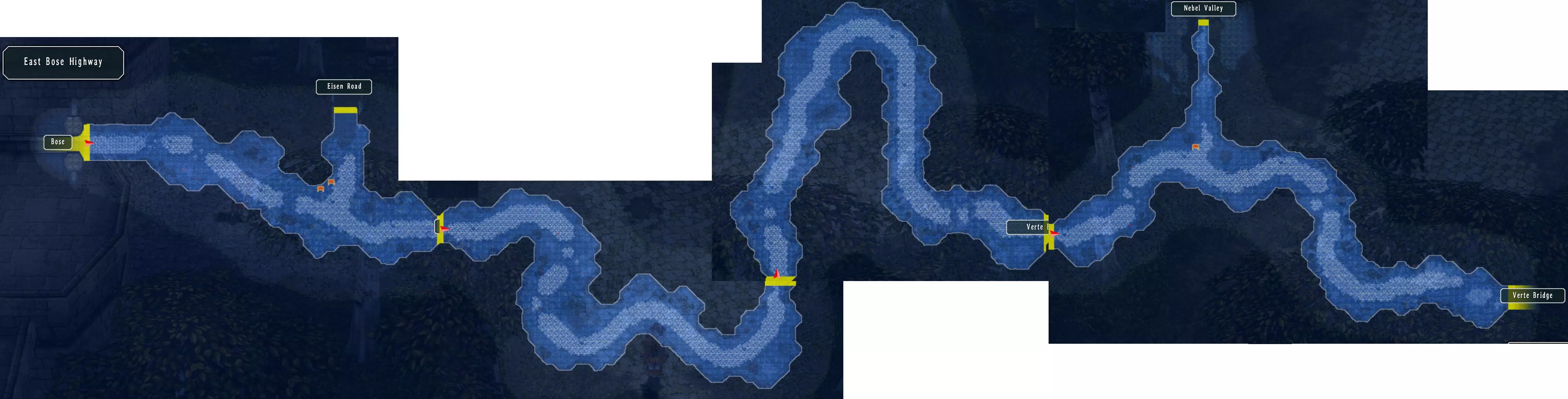 艾森大道与迷雾谷 在东柏斯公路没有宝箱,向左前往艾森大道和哈肯门。 这里有两个宝箱:复活药、蚯蚓(197/517) 哈肯门处有:狂热凝视,之后返回公路继续前往山谷。(52/68) 这里有三个宝箱:水耀石x200、幸运、回避4(M)(200/517) 左侧道路,在岔路口上方有怪物,下方继续前进。 尽头有宝箱,稍前位置有通道通往另一个宝箱。 右侧道路,左侧房屋内可免费恢复,右侧有宝箱。 返回柏斯,前往新安塞尔小径。