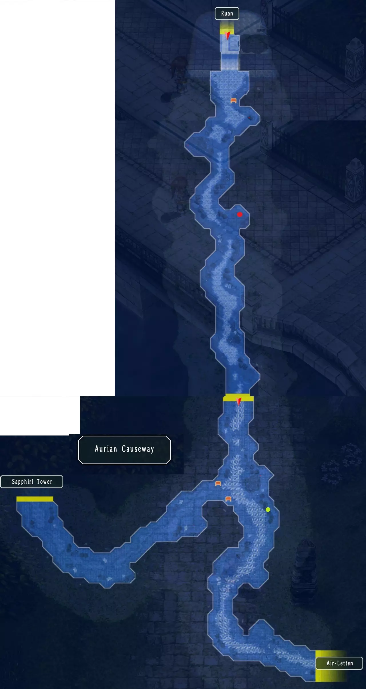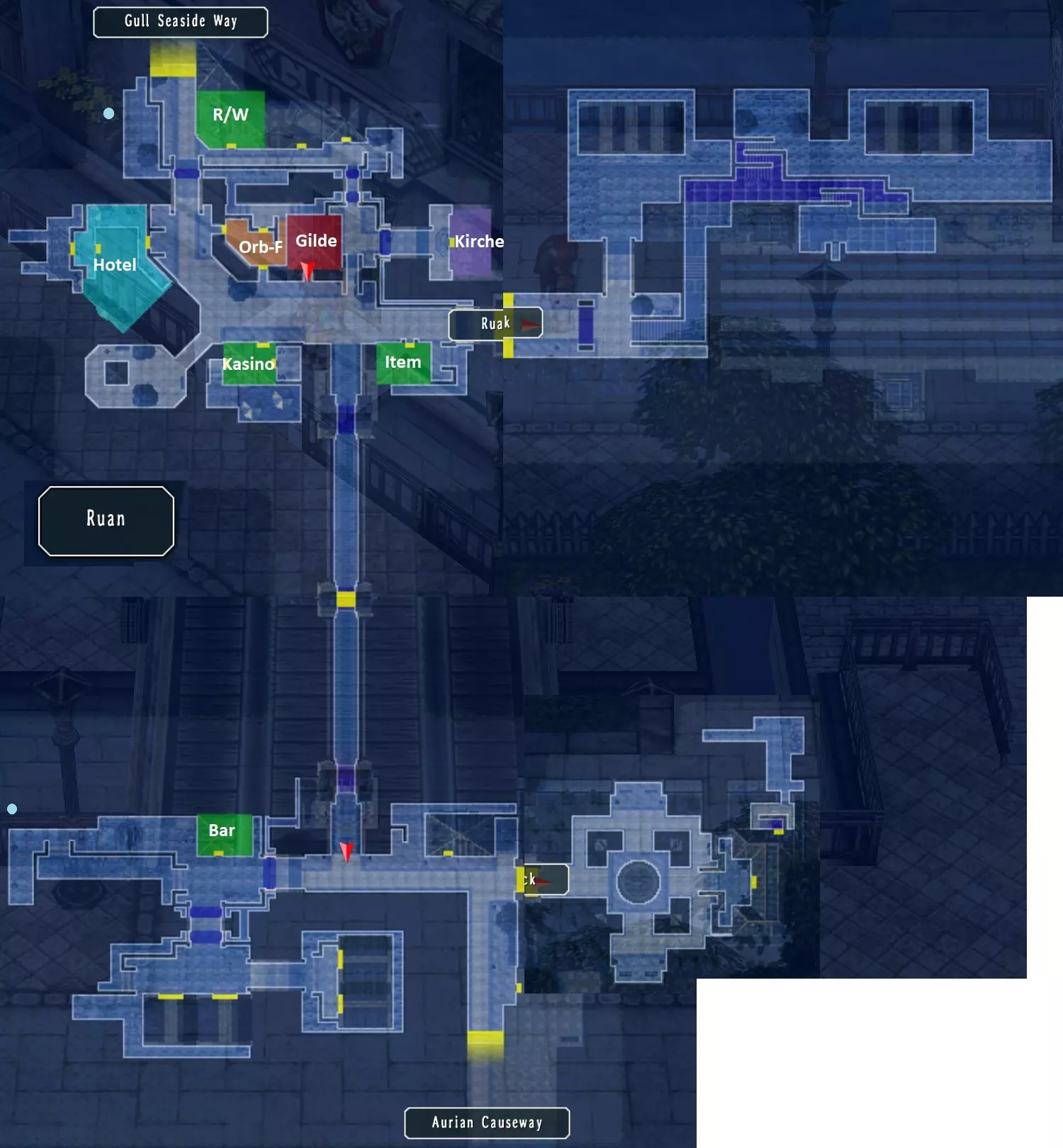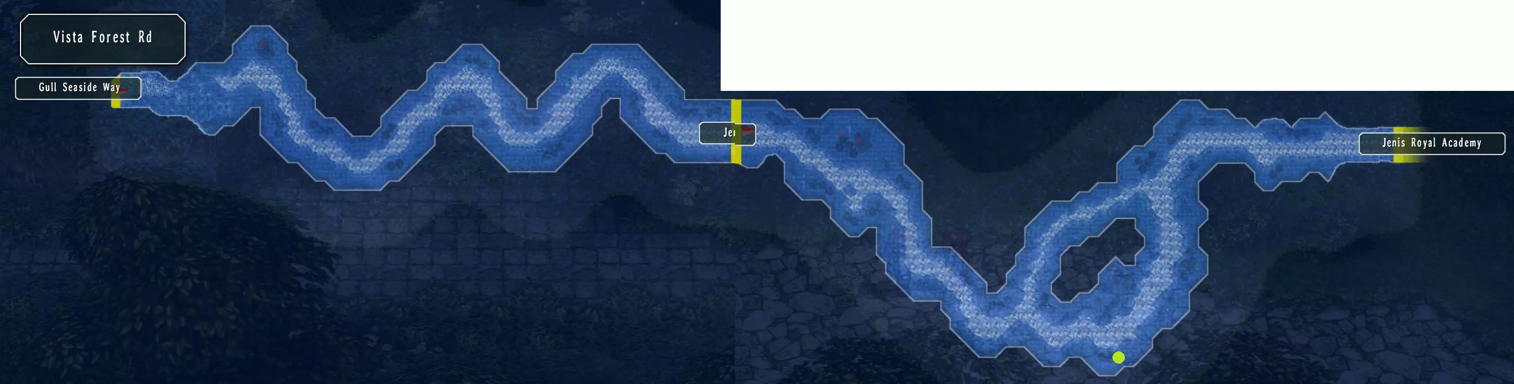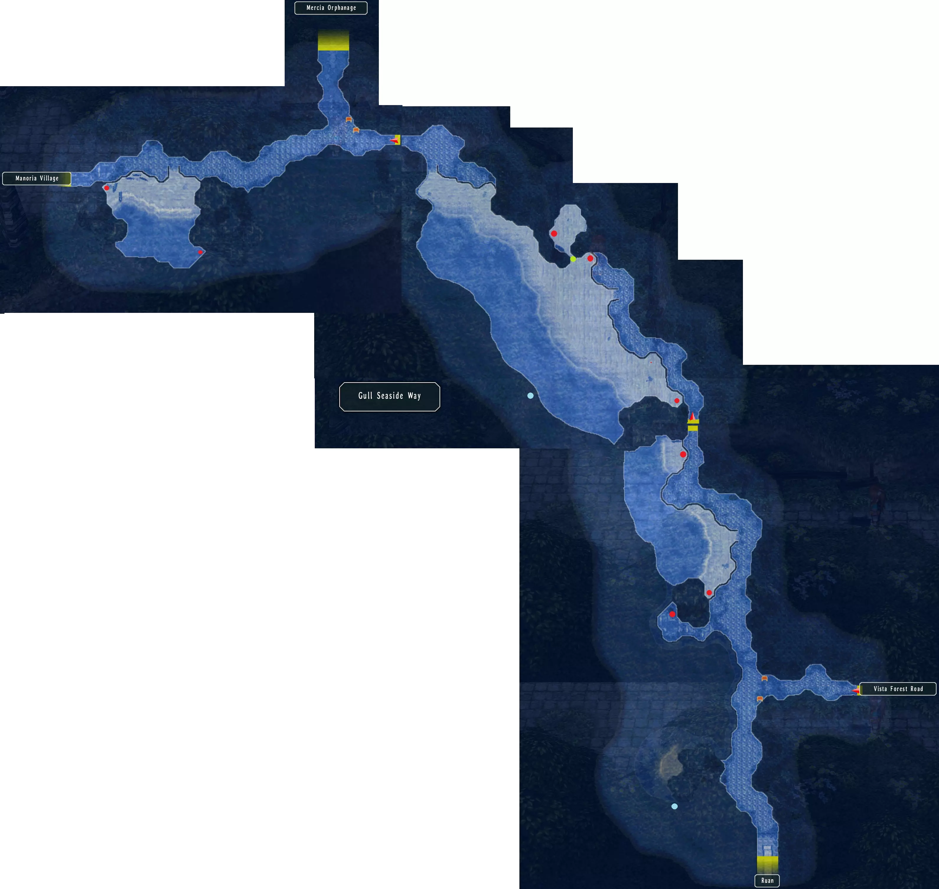艾因雷登 在这里可以购买:盐烤鱼。(7/68) 哈恩在艾因雷登最上层的房间里。向上走到尼克斯所在的建筑。 这里的上层也有一个钓鱼点。 海鸥海滨道 这里有八个宝箱:泪之 balm、嗅盐、惊喜曲奇、多毛类、绝缘胶带、硬底 loafers、复苏 balm、净化 balm(37/517) 向右走到维斯塔森林道的怪物处,奖励:1500米拉,2BP(18/382) 返回,在第二张地图:海鸥海滨道的怪物处,奖励:2500米拉,3BP(21/382) 前往孤儿院,之后继续前往玛诺利亚村。